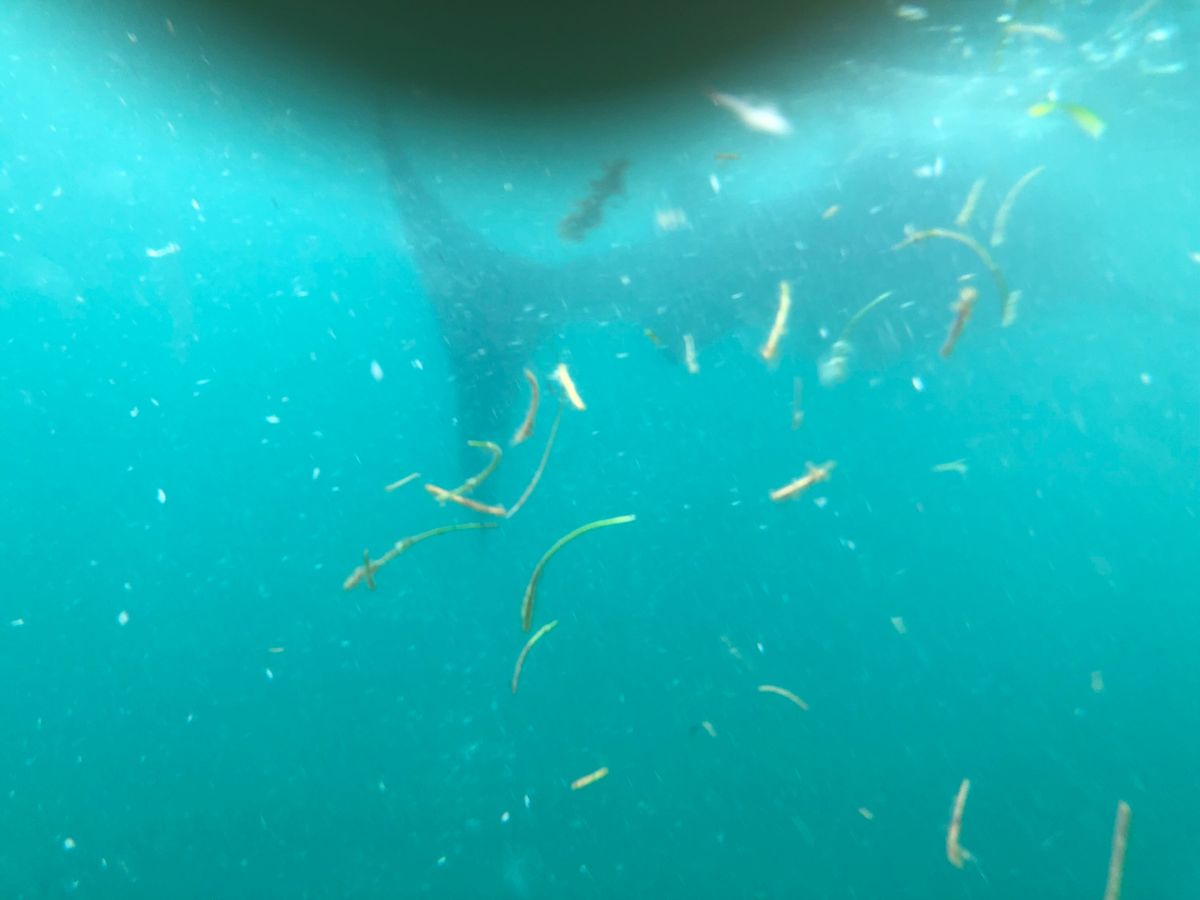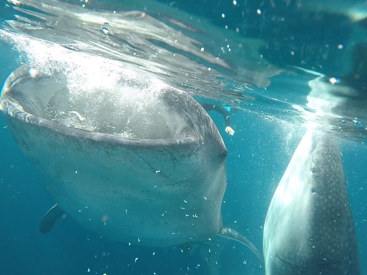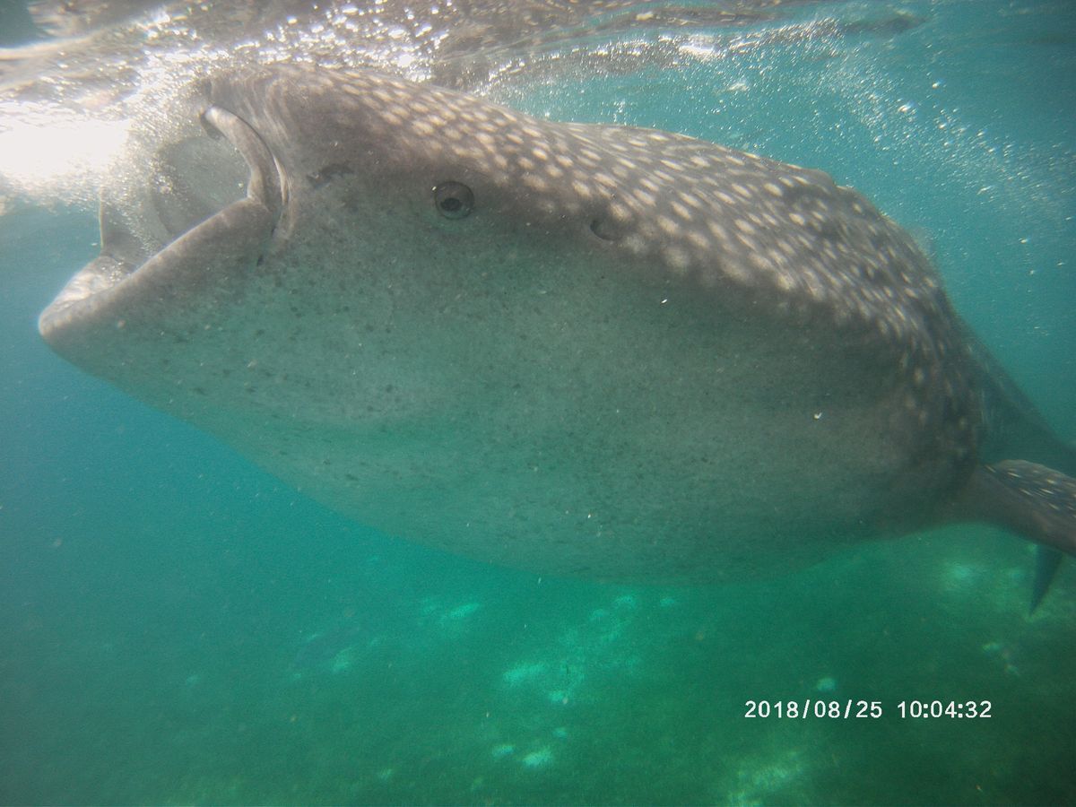 ジンベイザメの幼体を保護、飼育する目的で餌付けをしている海域で順番に船を寄せていきます。隣に陣取ったところで入水。水中で見てもかなりの迫力でした!