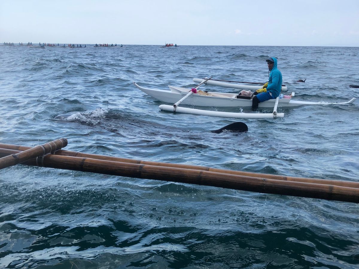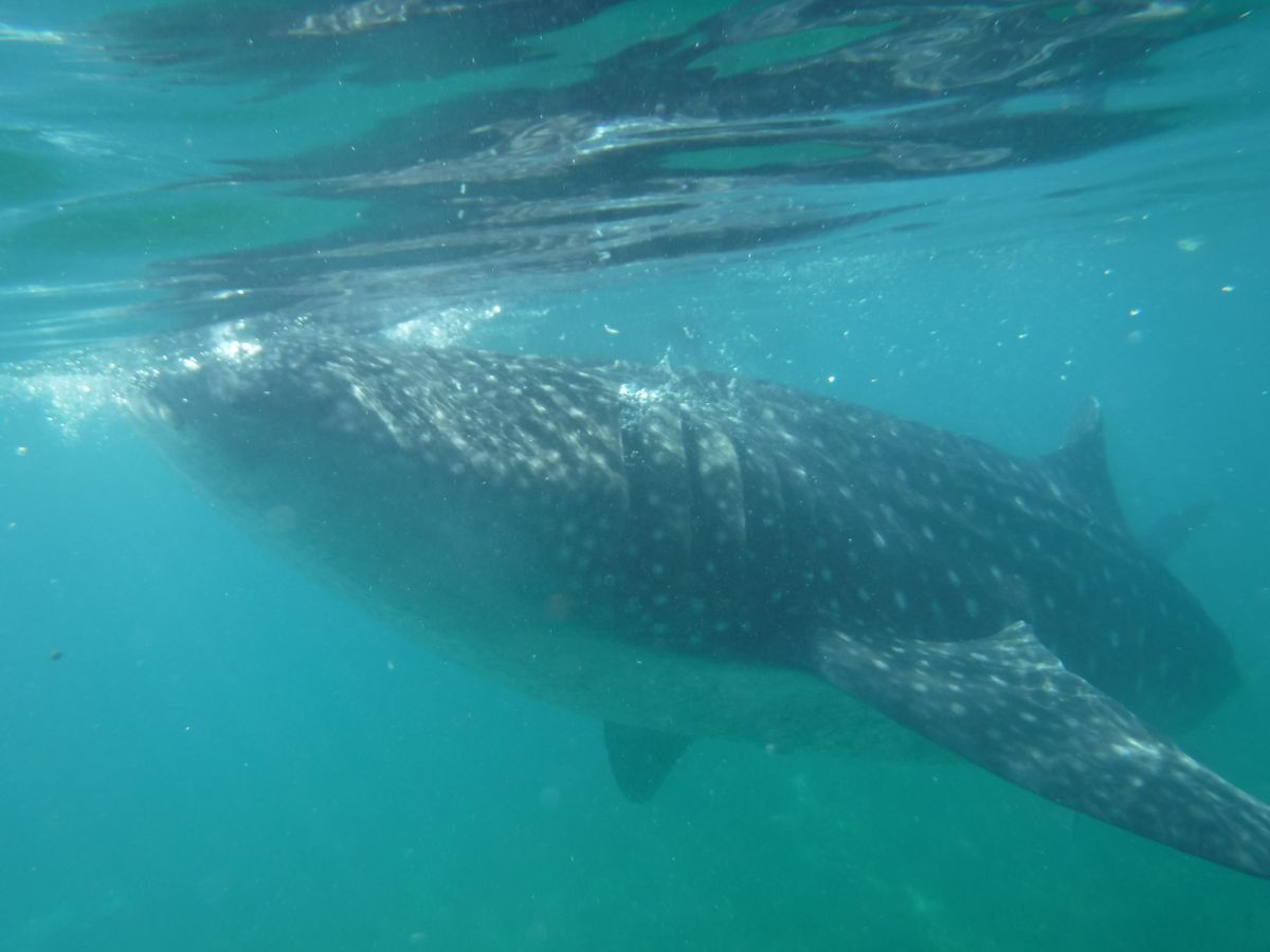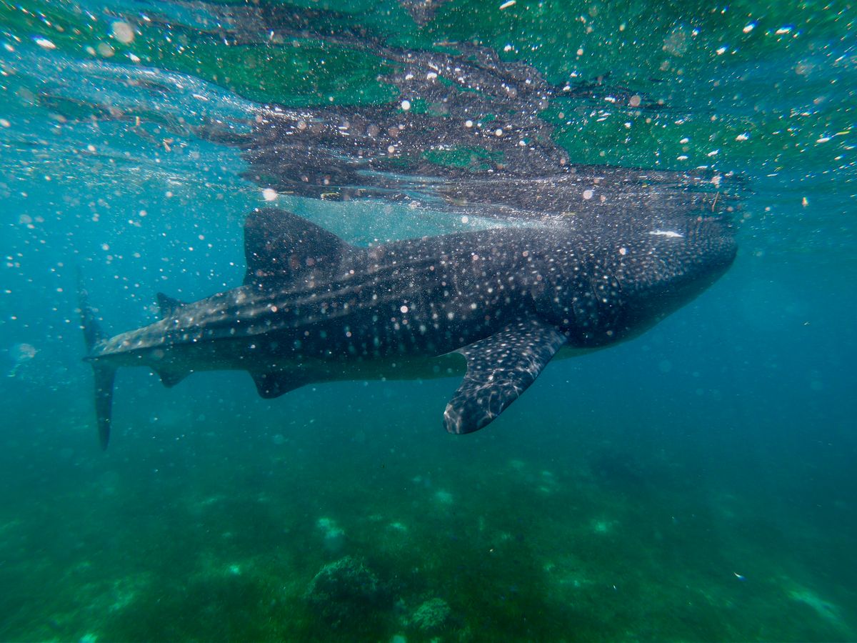 ジンベイザメの幼体を保護、飼育する目的で餌付けをしている海域で順番に船を寄せていきます。隣に陣取ったところで入水。水中で見てもかなりの迫力でした!