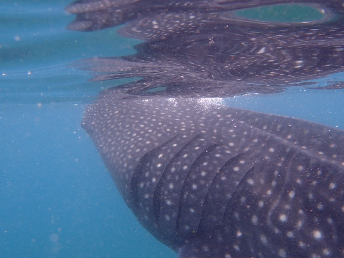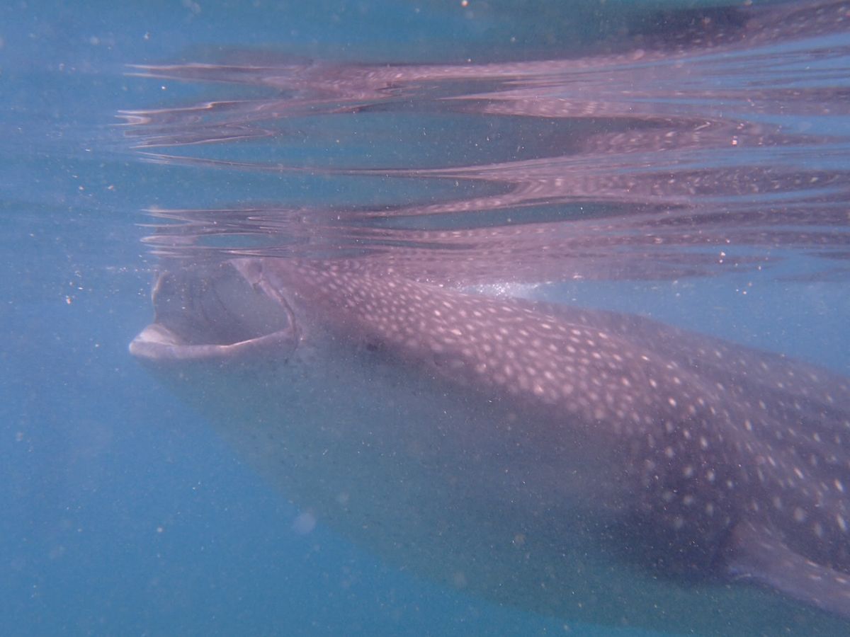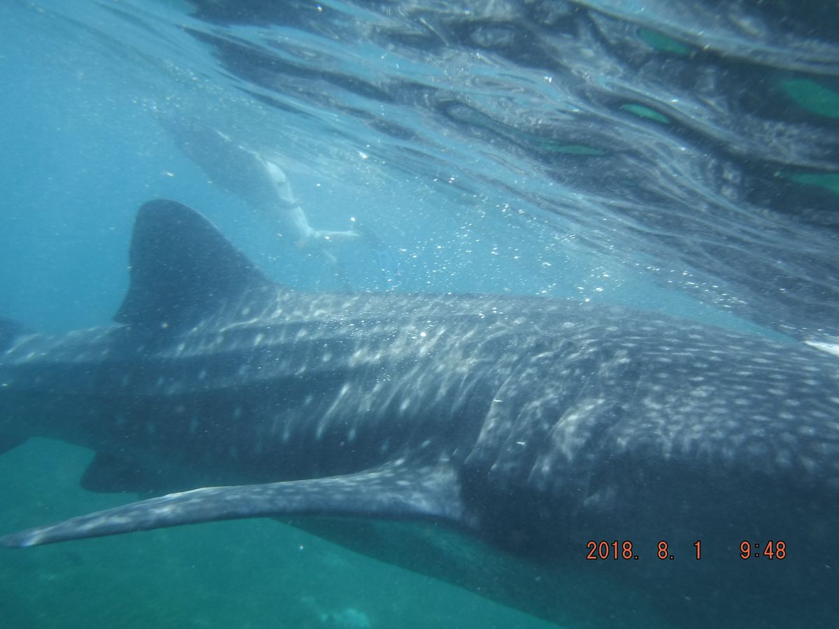 本当に目の前で優雅に泳ぐジンベエザメとの初対面は、一生忘れられない思い出になりました。現地のスタッフに撮影をお願いしたので、ひたすら修行のようにジンベエザメが来たタイミングで潜らされます。楽しくてテンション上がりますが、かなりキツかったです。ジンベエザメを直接見る機会も減ってしまうので、途中で撮影してもらうのをやめ、ゆっくりシュノーケリングするのもありだったかも。時間が30分もないと思うので、どうするかはあらかじめ良く考えておきましょう。