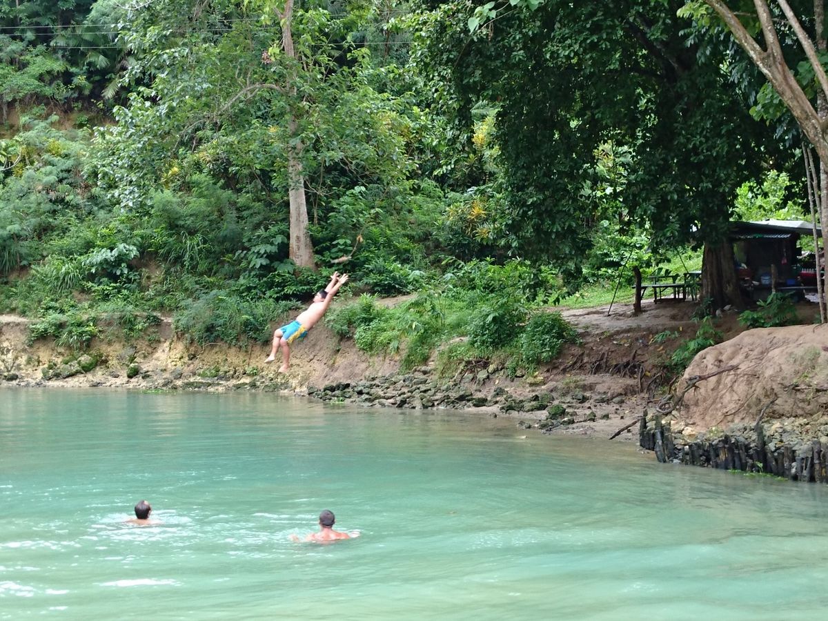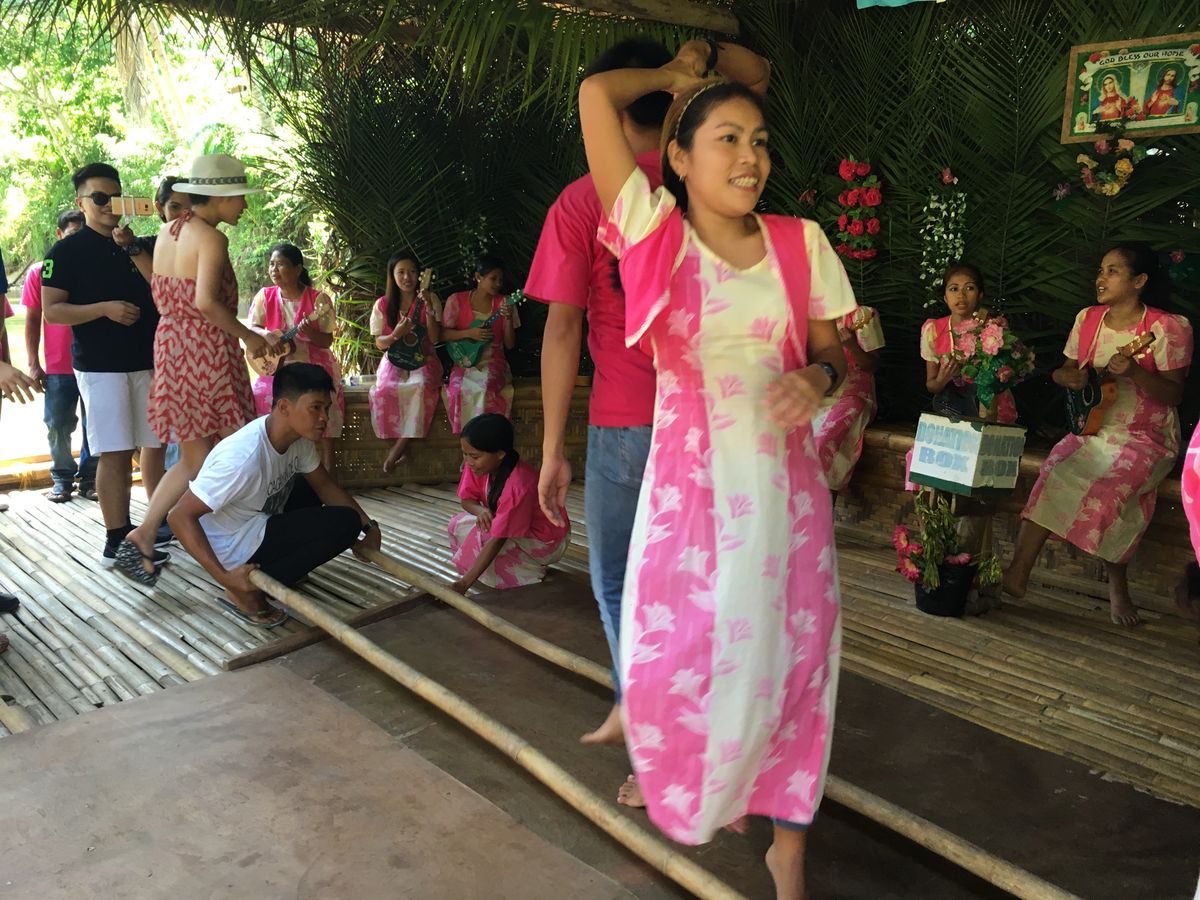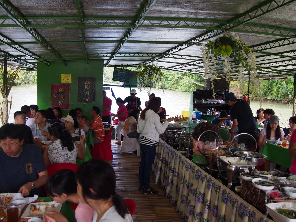 次に訪ねたロボック川のリバークルーズでは初めてのフィリピン料理を美味しくいただき、バンドの演奏と歌を聴きながら、南国ムードたっぷりの景色を楽しむことができました。川辺では現地の人が木にぶら下げたブランコを大きく揺らして川に飛び込んで遊んでいたりしていて、日本では味わえないような雰囲気を楽しむことができました。