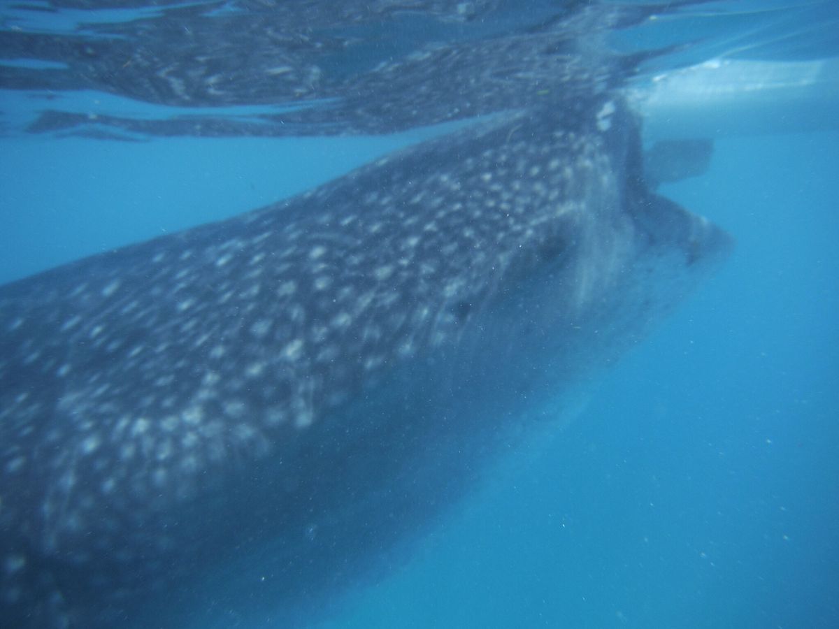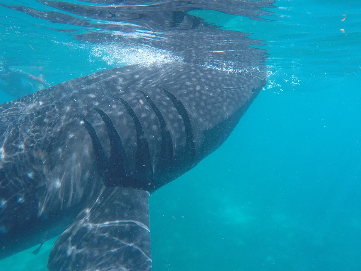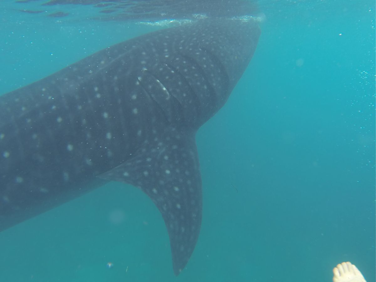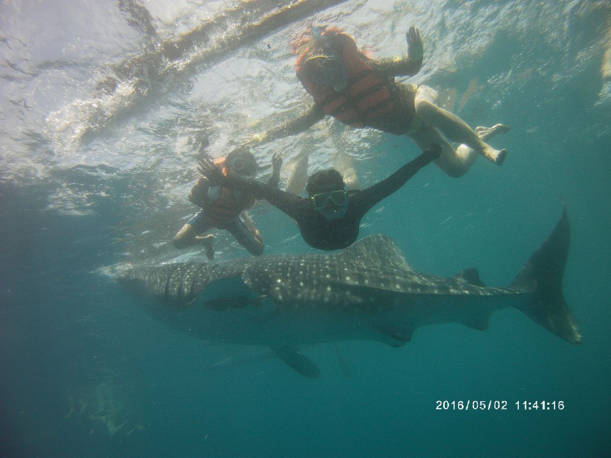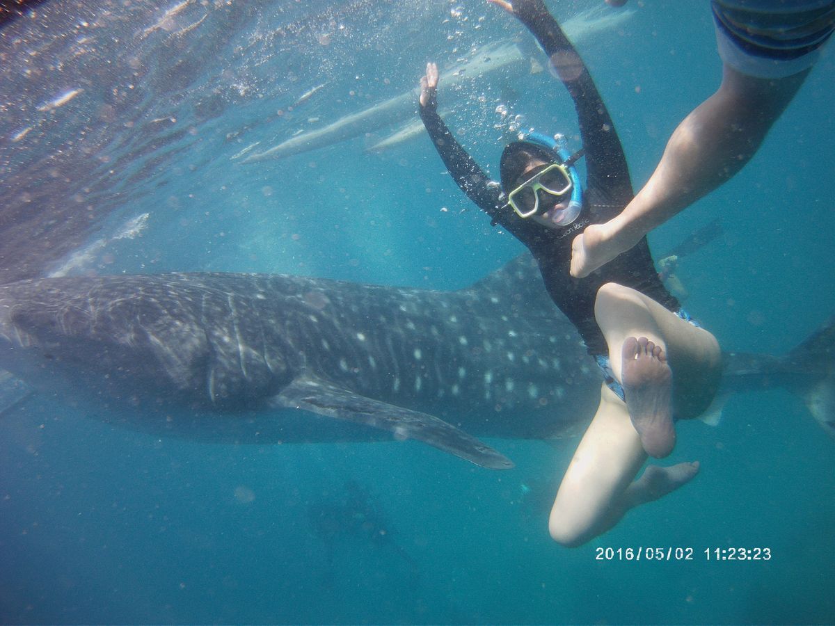 到着後、着替えを済ませジンベイザメが待つ海へ。私たちの目前に現れる巨体ジンベイザメの姿が大迫力で、今でも目に焼き付いています。基本的には食事中のジンベイザメを観察するスタイルです。ボートの近くに餌を撒いて頂き、ジッとしているだけで目の前を巨体が通過していきます。手を伸ばせば届く近距離をジンベイザメが泳いでくれます。約40分間、ジンベイザメとの時間を過ごす事が出来ました。ガイドに沢山写真を撮って頂き最高の思い出になりました。