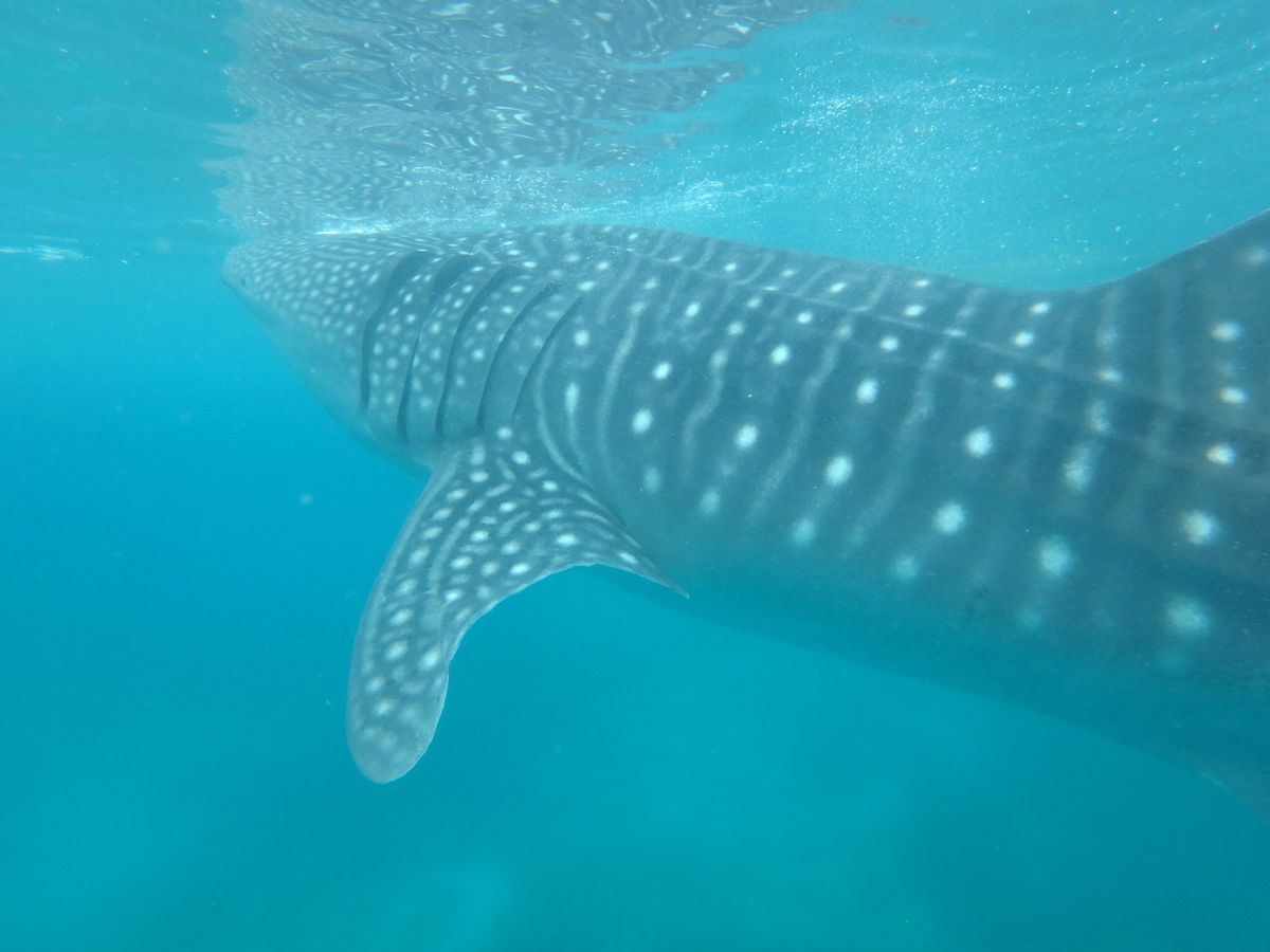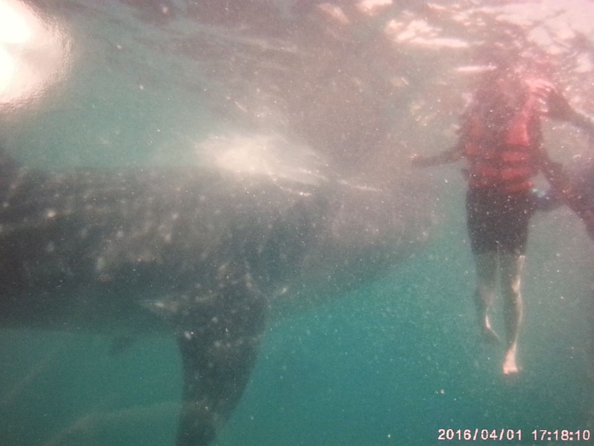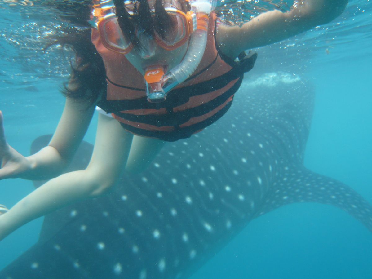 ライフジャケットをつけて、カヌーに乗り込むとすぐにジンベエザメが見えます!もっと沖にでるのかと思っていたので、とてもびっくりしました。ライフジャケットを脱いて、カヌーから降りろと、現地スタッフに英語で言われ、急展開(笑)。あまり心の準備が整わぬまま海へ(笑)。説明ではジンベエザメには五メートル以内、尾ひれの周りは六メートル以内に近づくなと言われたのですが、潜った途端目の前にジンベエザメがいました!不可抗力です(笑)。有料で借りた水中カメラでスタッフさんが撮ってくれます。one,two,threeでもぐらされ、100枚以上撮ってもらいました。潜っていない間は、カヌーにしがみついて、ジンベエザメが近づくと潜り。の繰り替えし。私はとても楽しかったのですが、彼女はあまり泳ぎも得意ではなく、潜るのに必死でした(笑)。一応私やスタッフさんが無理やり沈めたので、写真はとれましたが。素潜りが余裕な人はとても楽しめるかもしれませんが、泳ぎが苦手な人には少し厳しいかもしれません。