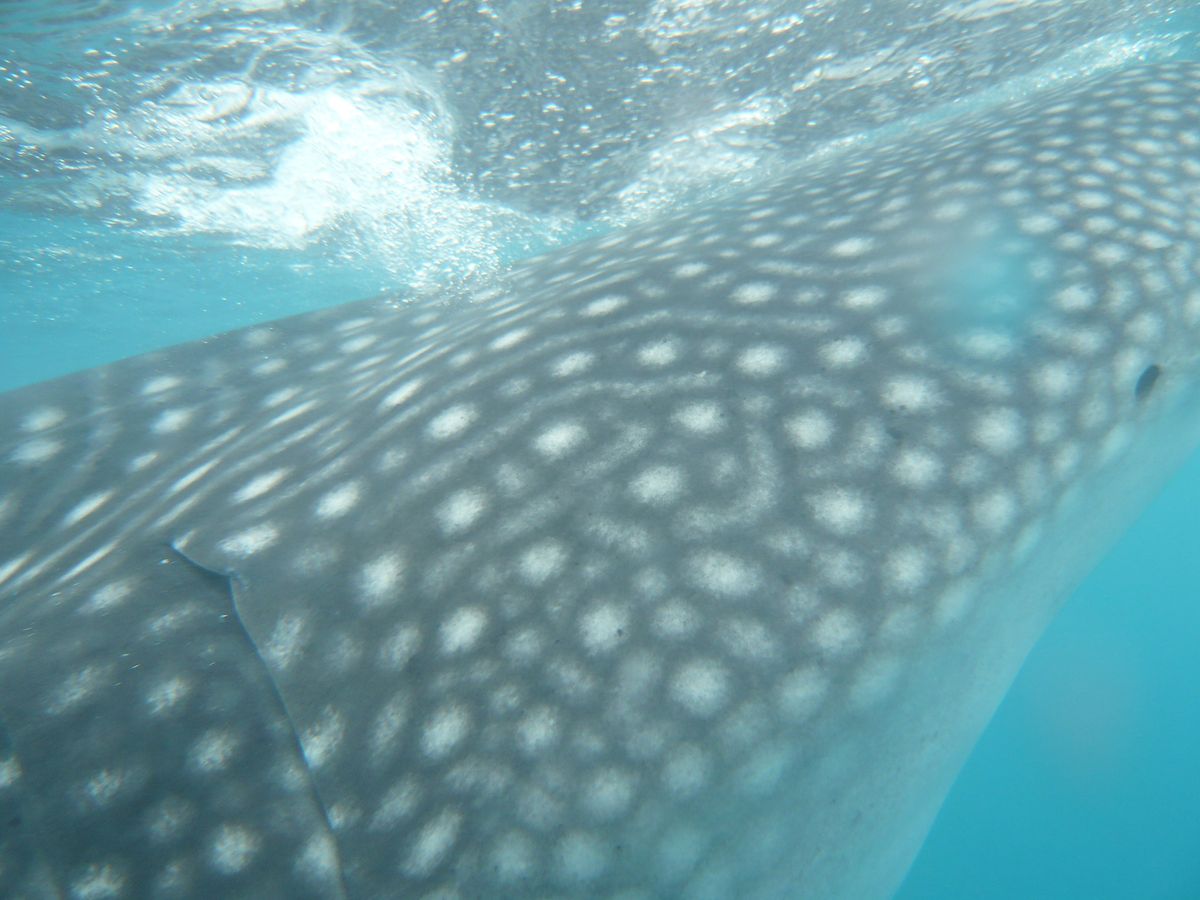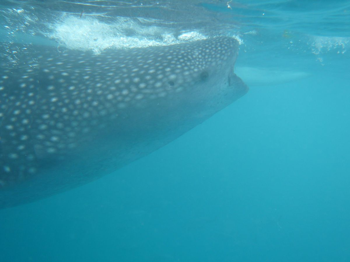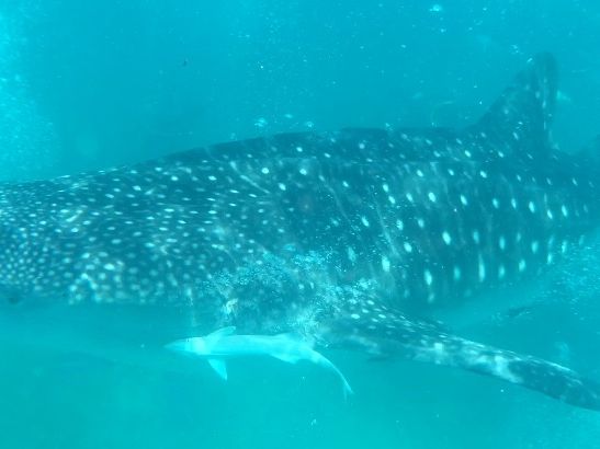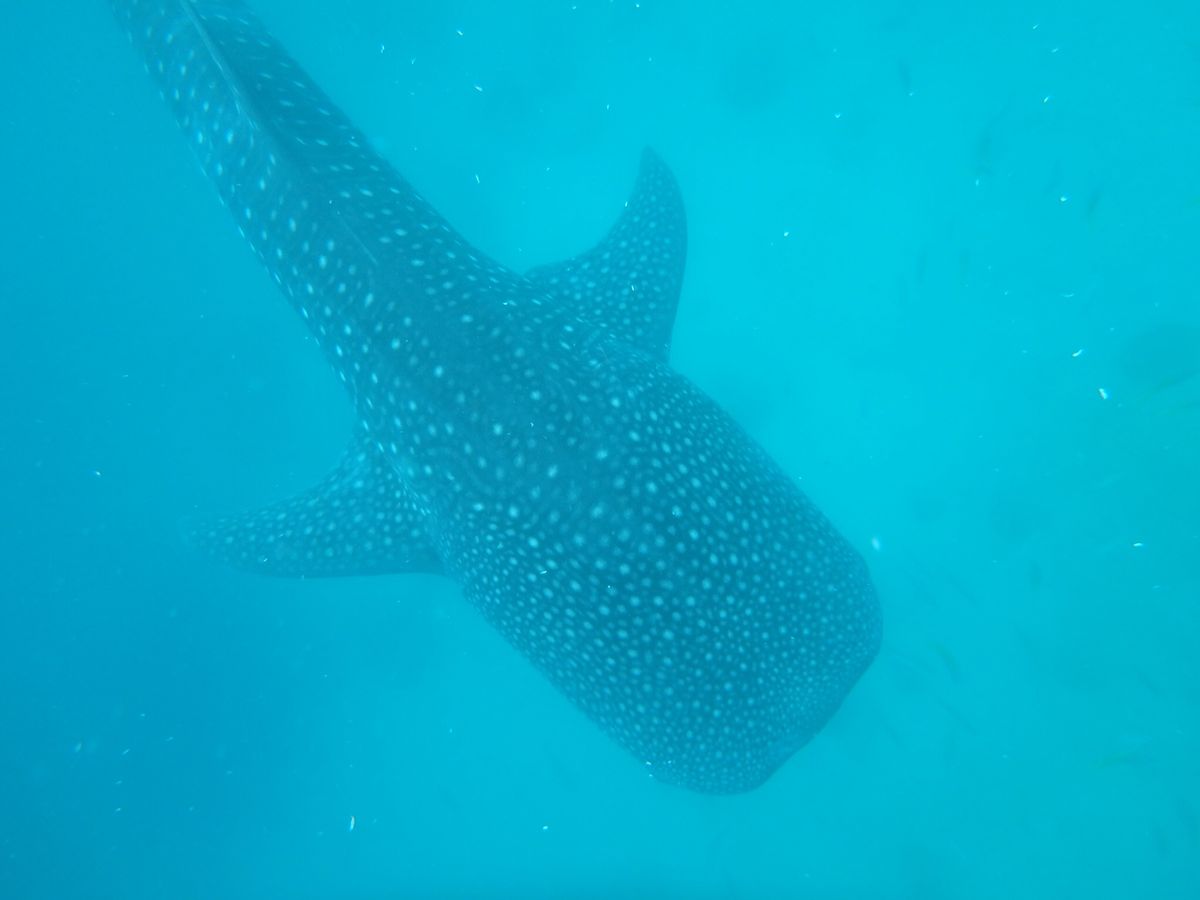 ライフジャケットをつけて、カヌーに乗り込むとすぐにジンベエザメが見えます!もっと沖にでるのかと思っていたので、とてもびっくりしました。ライフジャケットを脱いて、カヌーから降りろと、現地スタッフに英語で言われ、急展開(笑)。あまり心の準備が整わぬまま海へ(笑)。説明ではジンベエザメには五メートル以内、尾ひれの周りは六メートル以内に近づくなと言われたのですが、潜った途端目の前にジンベエザメがいました!不可抗力です(笑)。有料で借りた水中カメラでスタッフさんが撮ってくれます。one,two,threeでもぐらされ、100枚以上撮ってもらいました。潜っていない間は、カヌーにしがみついて、ジンベエザメが近づくと潜り。の繰り替えし。私はとても楽しかったのですが、彼女はあまり泳ぎも得意ではなく、潜るのに必死でした(笑)。一応私やスタッフさんが無理やり沈めたので、写真はとれましたが。素潜りが余裕な人はとても楽しめるかもしれませんが、泳ぎが苦手な人には少し厳しいかもしれません。
