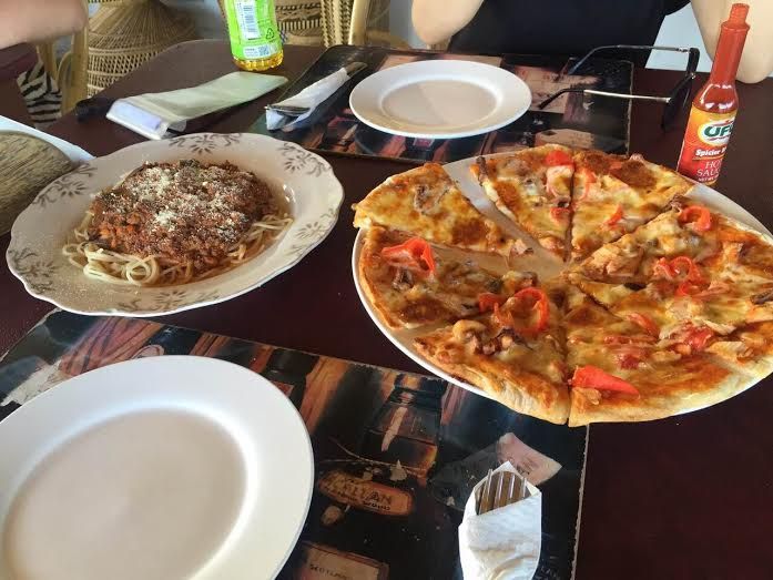 絶景が見渡せるレストランで、シーフードピザとミートソースパスタとマンゴラッシー(追加)でいただきました。綺麗な海をみていただく昼食は格別でした!!!!!