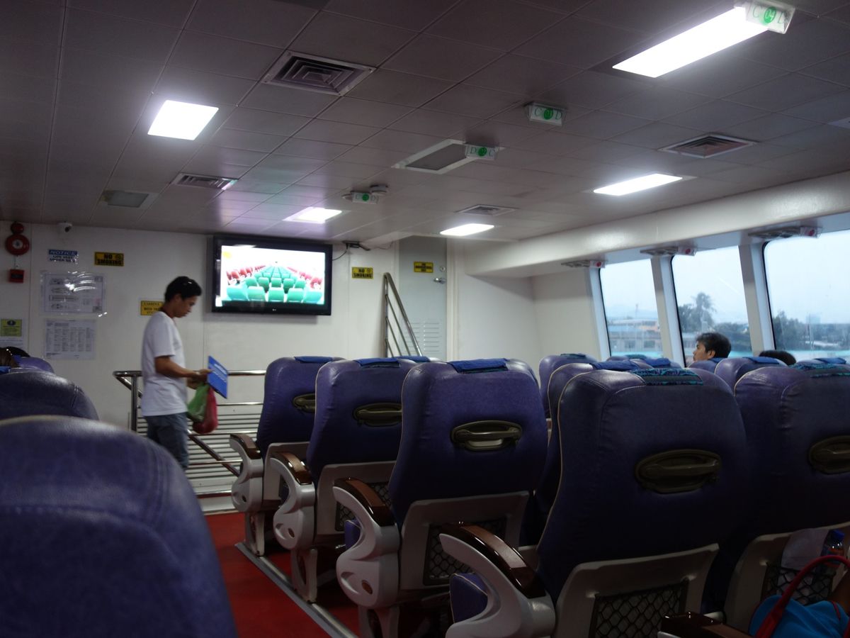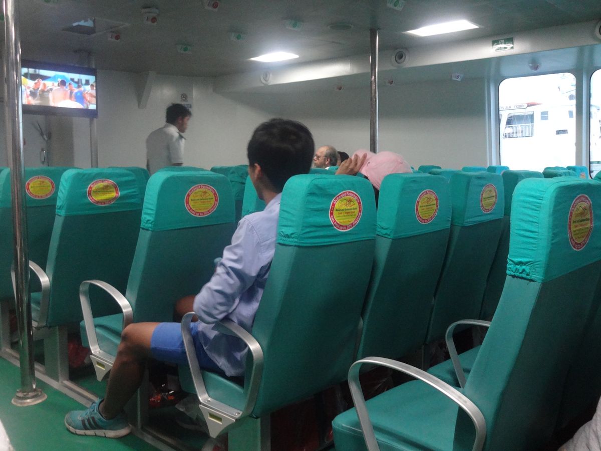 港から高速船で2時間ほど。船内はクーラーガンガンでパーカーや長袖がないと辛いかもしれません。船内では行き帰りともに映画のDVDをながしてます。船外デッキなんかはなく、本当に移動のみの時間なので暇を潰せる準備を。