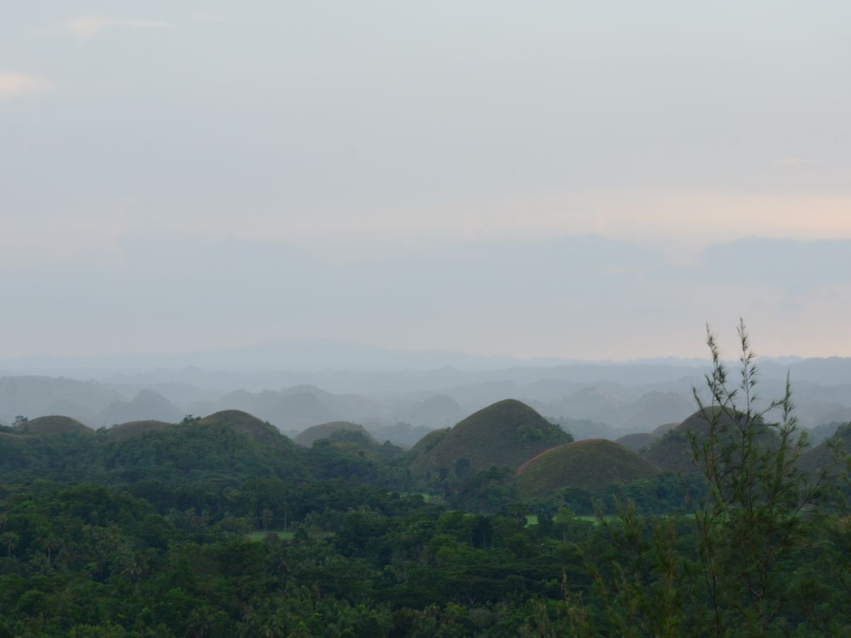 ハーシーズチョコの形のちいさな山々が連なる景色はきれいでした。上まで登ってみる眺めも最高です。フェリー乗り場は極端に寒いので、ひえに注意