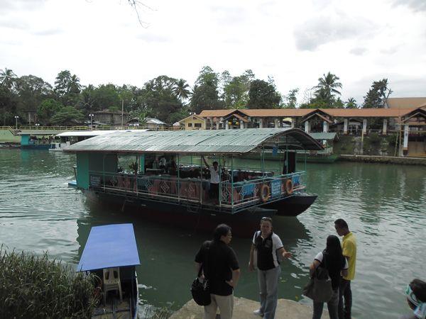 ロボックリバーのクルージングランチ。乗り込んで竹でできてるのがわかりちょっと不安に。フィリピン料理が大皿に
