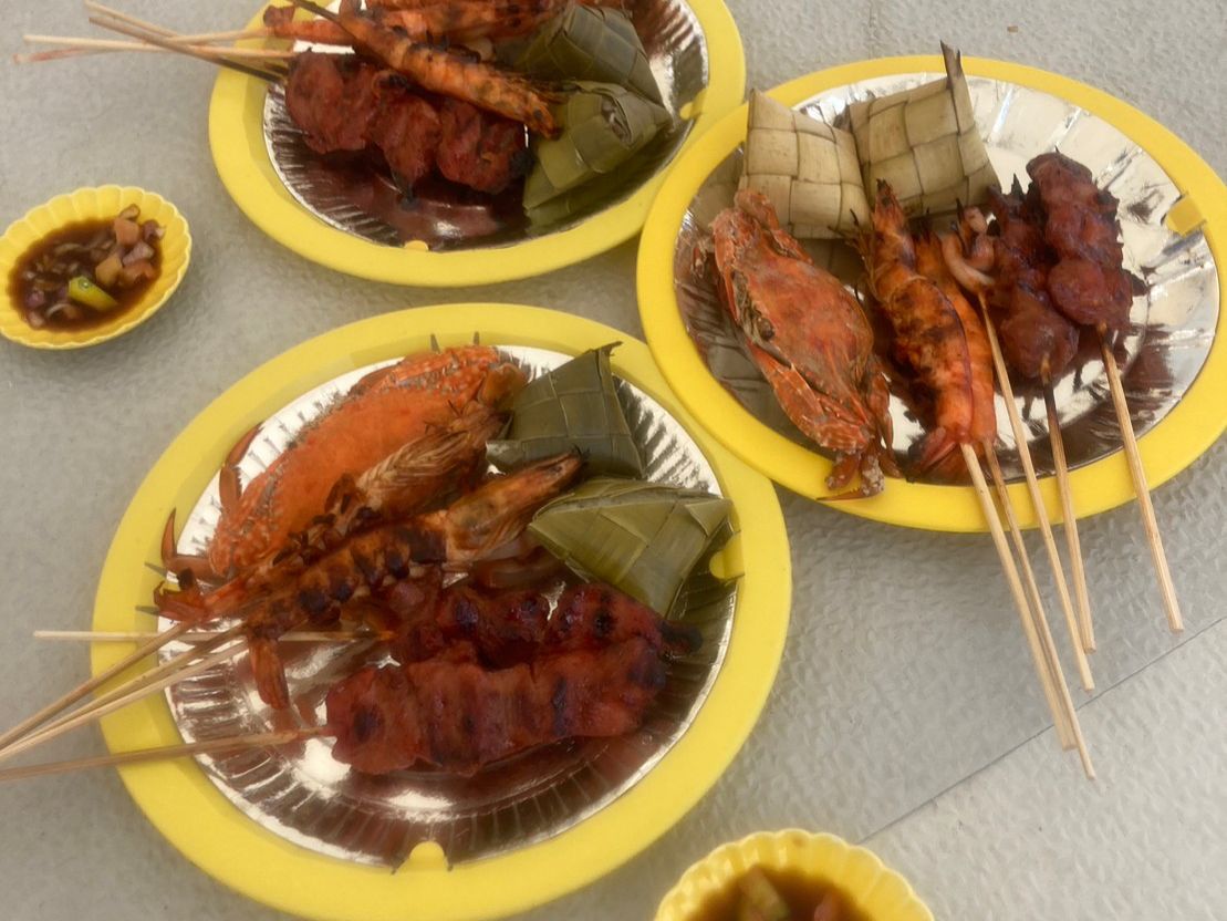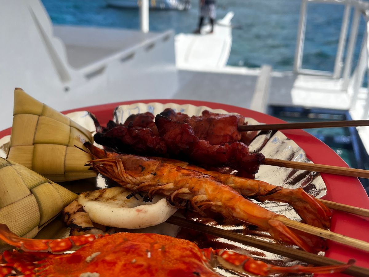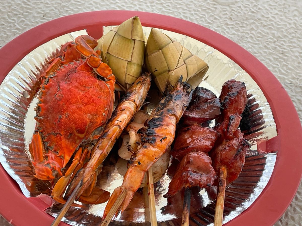 →料理は、お肉とエビとイカの串焼き、焼いたカニ、白米、焼きそば(?)、スープ(あたたかい)、マンゴー、パイナップル、バナナでした。