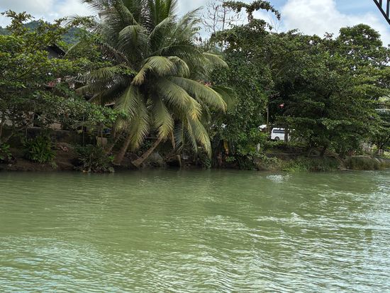 二人乗りバギーの運転は車と同じ、写真は小学生が運転しています。わざと泥水に入り大騒ぎ、終わったときには全身どろだらけ。川のクルージングでのシーフード昼食は満腹。ターシャは触れませんでしたが近くでみることができました。楽しめるツワー。