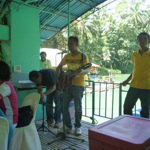 水上コテージにてちょっと早めの昼食です。食べ放題と聞いてましたが、船なので一度なくなったら補充はされません!早い者勝ちかも。船上では陽気なギターで誰でも知ってる洋楽や日本の歌を歌ってくれるシンガーがました〜ノリノリです。