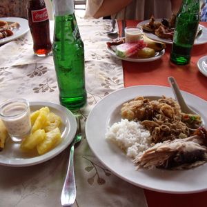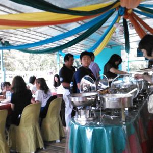 ロボックリバーのクルージングランチ。乗り込んで竹でできてるのがわかりちょっと不安に。フィリピン料理が大皿に