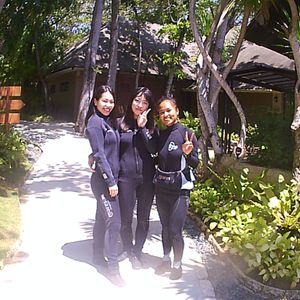 学生2人様にご参加頂いたシーウォーカー(ヘルメットダイビング)、ジェットスキーでは、お客様に安心して、安全に楽しくアクティビティにご参加いただけますよう、日本人スタッフがしっかりと事前説明を行っております。