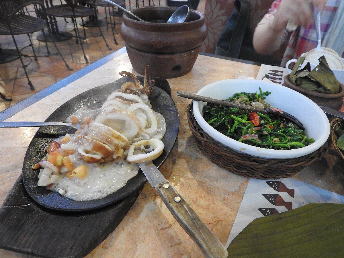 メニューは卵スープとお肉の春巻き、焼きそば、いかに野菜を詰めて炒めたもの、チキン、ライス、マンゴーアイスケーキでした!デザートは忘れられていたようでガイドさんが言ってくれて持って来てもらいました!デザートを食べてる時にカレーを2回持って来ようとしたけど別のテーブルのだったのかな?ワンドリンクついてますが、バナナシェイクは別料金だったので無料のドリンクはちゃんと確認した方がいいですね!でも85ペソ(200円ちょい)だったのでドリンク安いと思います! ご飯はどれもとても美味しく頂きました!特に私はイカの料理がいい味付けで美味しかったです!ただ、いかの中の野菜の中に青唐辛子が結構入っているので、辛いの苦手な方は要注意です!(笑)