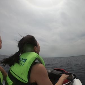 まずは初体験のジェットスキーで二人乗りをチョイスし1時間コース。インストラクターから運転を変わり、オランゴ島へ向け出発!!サルパアイレットを一周しマクタン島へ戻りました。風上に向かう際の波しぶきが目に入ること必至。サングラスは必須。
