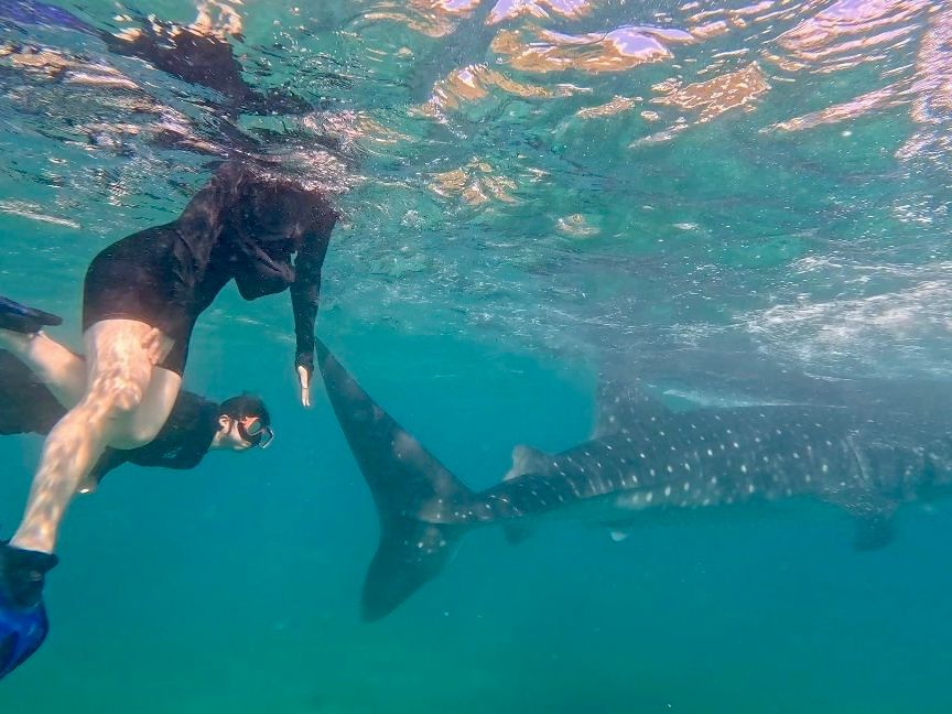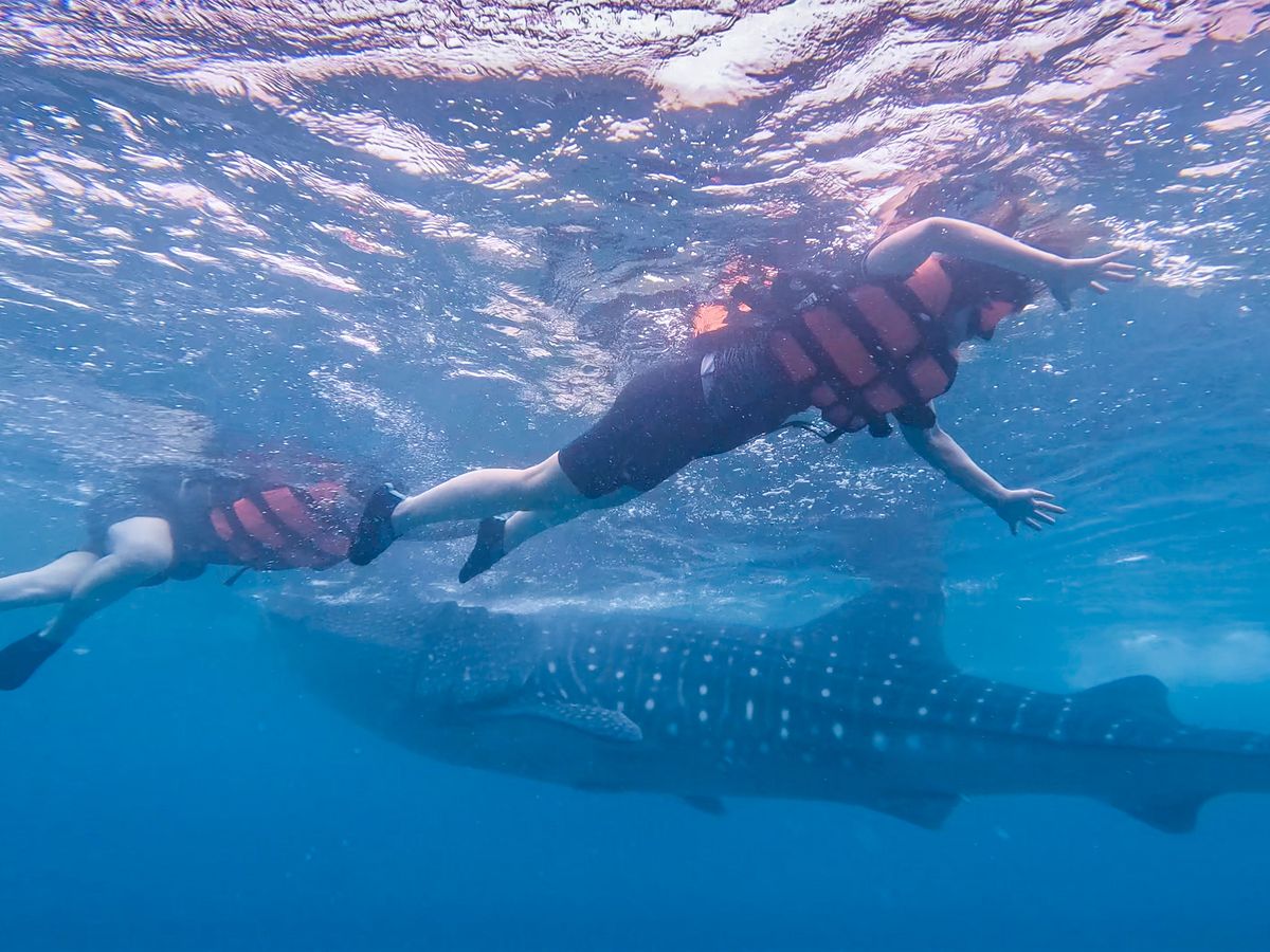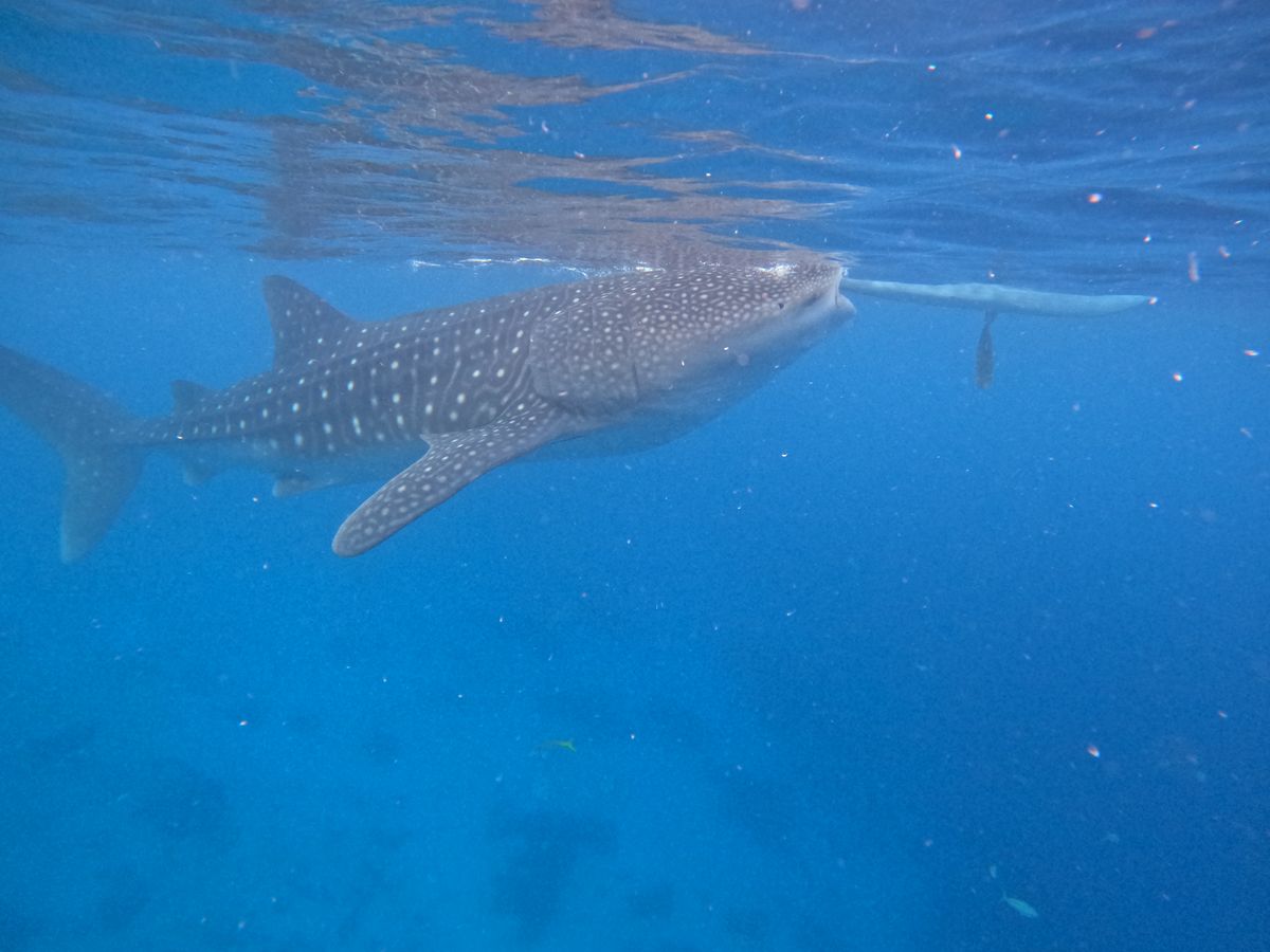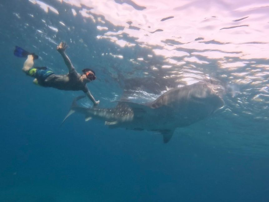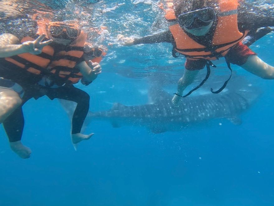 良い頃合いにジンベエザメエリアに戻ると、ツアーの一環としてGoProを貸し出してもらえました☺️自分のスマホを海に持ち込むこともできなくはないですが、無くす可能性を考えるととても怖いなと思っていたので、海の上や水中の様子を記録に収めることができるGO Proを貸し出してもらえてありがたかったです!かなりの近距離でジンベエザメを見ることができ、かけがえのない体験となりました。(船に掴まる部分はありますが、浮き輪などはないので泳げない/泳ぐのがかなり苦手な方はツアー参加が厳しいかもしれないです)