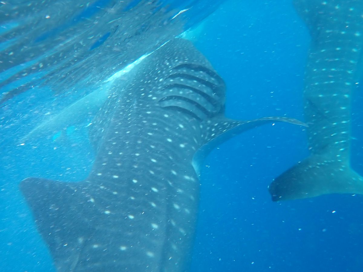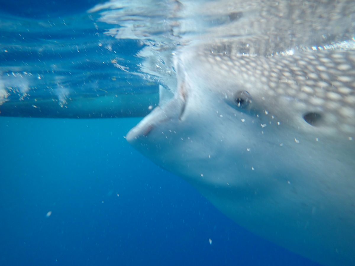 順番がきたら、船に乗り込んでジンベイザメのいるところまで行きます。(陸ではスノーケルだけ渡され、船の上でマスクを渡されます。別々なので慣れてない人には使いにくいかもです。)1度に5隻?くらいの船が同時に行き、30分で交代という感じでした。欧米人が多く、みなさん薄着でライフジャケットはつけずに泳いでます。(クラゲにさされたと騒いでる方がいましたので、上下ラッシュガードが安心です。)