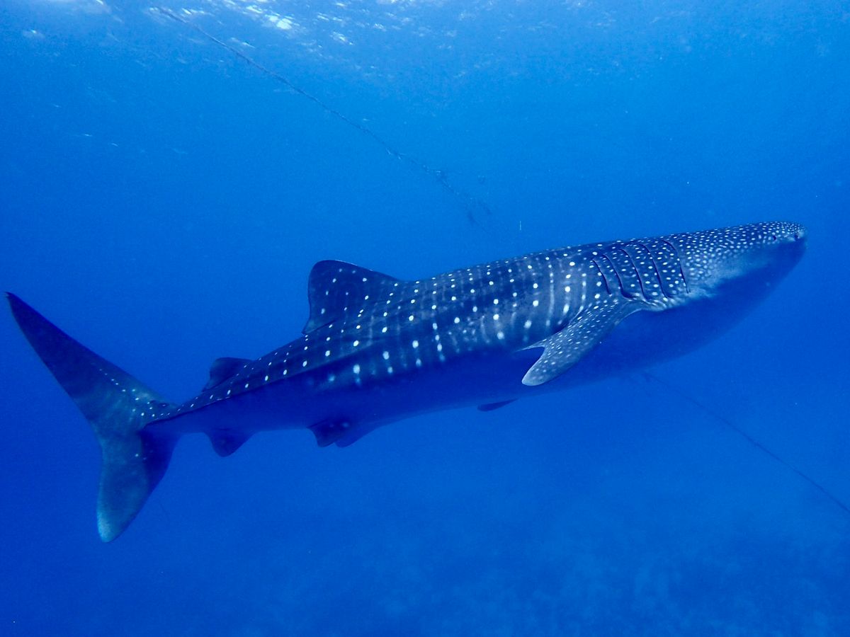 表層付近で撮影したらサメの模様まで撮影可能ですが、表層にはスノーケラーやボートが多くお互い危険な為、極力表層には近づかない様に決められております。