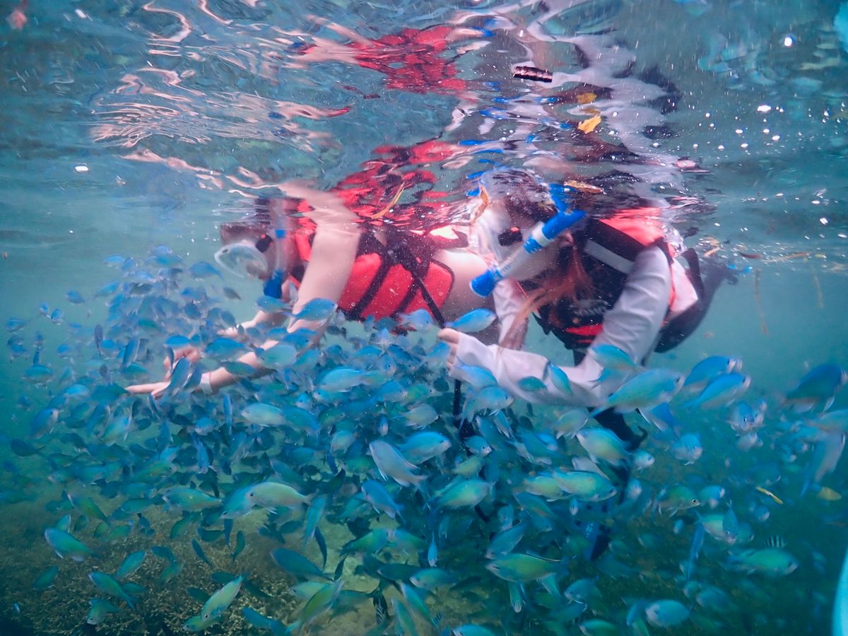 集合から明るく優しいスタッフさんと一緒に島付近のシュノーケリングスポットへ。魚に餌をやりながらのシュノーケルなので臨場感たっぷりです。一通り泳いだ後は船から水中へ飛び込みをして遊んだり自分たちで写真撮影をしたり、ツアーと言っても、のんびりと好きなように過ごせる良い時間でした。疲れてない?大丈夫?と度々声を掛けてくれるスタッフさんのおかげで安心して潜ることができました。