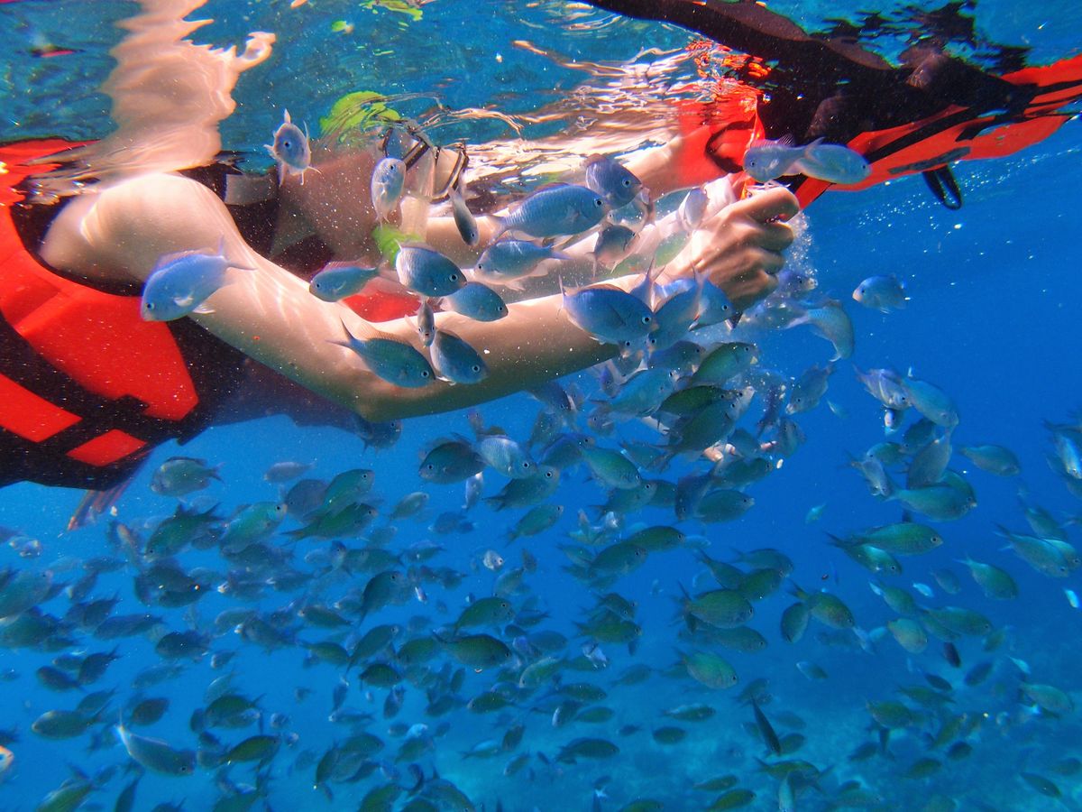 本当に水中がキレイで魚もいっぱいで申し分ないです!!パンをあげてるとたまに魚につつかれます☆