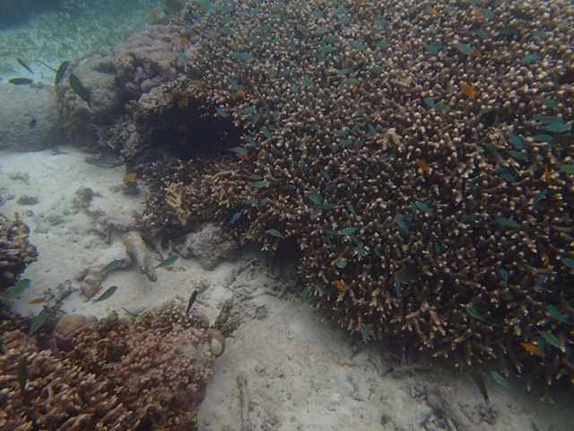 一旦水中眼鏡とフィンをつけて水中を見ると昨日より綺麗なサンゴが広がりカラフルな魚影も濃い‼
