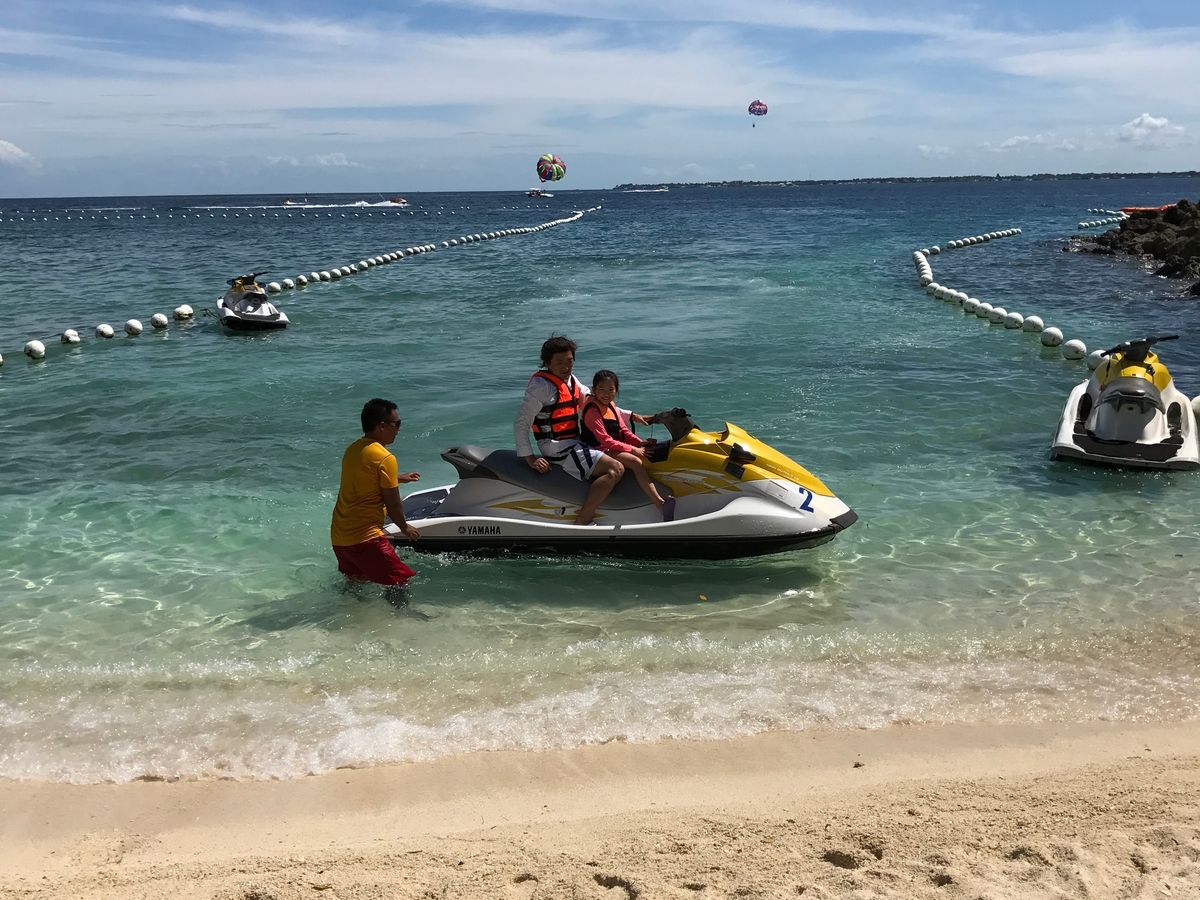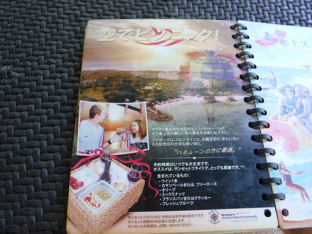 集合場所のスコッティーズカウンターが私達の泊まるシャングリラマクタンホテル敷地内にあるからにはマリンアクティビティを楽しむと決めていました 。当日集合時間の10分前に行くと説明は日本人スタッフが丁寧にしてくれて安心できました。沖まで遠くて船酔いにとても苦しんだグアムでの経験からどれくらいかと聞くとすぐですとのこと。念のため酔い止め薬は飲んできました。9時スタートの予定より15分待ちましたが 天気と風と波には逆らえません 。フィリピン人男性スタッフ 三人が 私たち二人にフィリピン訛りの英語で説明を始めましたが 全て yes で大丈夫 さっき聞いた内容と同じだからです 。ライフジャケットと装具をつけてくれスタートします。はじめに足先を海水につけるサービス(タッチ&ゴー)で 一気に気分が盛り上がり 同時に大声で笑ったのでリラックスできました 。空中飛行時間10分 で十分満足です。強風で目が乾くので首にかけてきたスイミングゴーグルが とても役に立ちました。防水デジカメを別売のストラップで手首に固定して動画を撮影しました。おかげであの感激が今でも蘇ります。