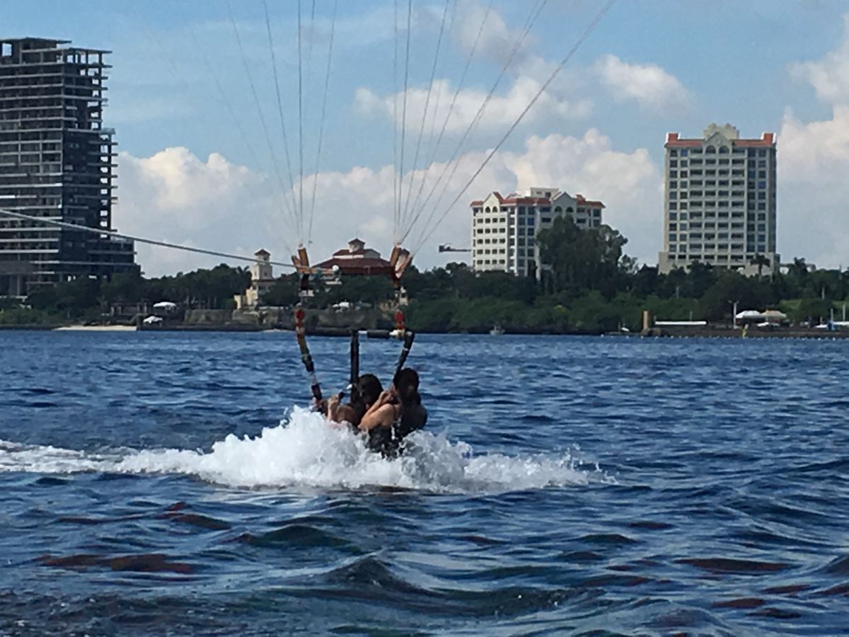 7月の連休に人生発パラセーリング!昨年に宿泊ホテルから見てずっとしたいと思っておりました。今回のセブ滞在のメインイベントとして予約。せっかくするのだからマグナムフライトを予約しました。5歳の子供(男児)と一緒にフライトしようと施行会社に問い合わせしたところ、親同伴なら可との御返事を頂きました。この度の宿泊先からもパラセーリングをしているのがみえていて否が応でもテンション上がってきました。宿泊施設に迎えにきて頂き出発地のシャングリラホテル内へ!リゾート感満点の施設です。誓約書にサインしてフライトを待っている途中にパンフレットを見ていると「空でピクニック!最高にロマンチックな体験」というパラセーリングしながら空でワインと軽食を楽しみながらサンセットを楽しむというプランが目に留まりました。できるのかな?と思いましたがフライト後には次回来た時に体験したいと思う位フライトは安定しておりました。さてフライトですが、まず救命胴衣とハーネスを着けてスタンバイ、ボートが走り出し、パラシュートがたなびくとロープのロック解除!我々も大空に羽ばたいていきました!天気のよかった事もあり最高の眺めでした!フライト自体は多分鳥が優雅に飛んでいるとこんな感じかな?と思う位飛行も安定し、写真・動画もたくさん撮れました。最高到達点から徐々にロープが回収されてきて、ランディング前に水面にタッチアンドゴーも。少し濡れましたがそれもまた一興でした。息子ももう一度やりたいねと降りた先から言っている位楽しかったようです。やはりやるならマグナムですね!