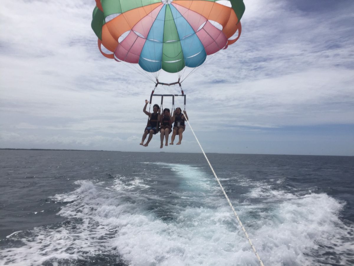 今回、初めてパラセーリングをやったのですが最高でした。シェラトンのホテルの中から行ったのですが、ホテルの中も綺麗でした。着くと日本人スタッフもいて安心。連れて行ってくれたのは現地の人でしたけど優しい。いざ飛ぶとどこのホテルよりも高いし最初は怖かったけど、もう景色も最高で鳥になったような気分でした。飛んでる時間は10分でしたが長く感じました。写真も下からも撮ってくれたので記念になります。貴重な体験が出来たので良かったです。またやりたいです。綺麗な海と綺麗な空で本当に楽しかったし幸せでした。おすすめです。送迎もあり、朝早くにやったので帰ってきてから夜までもたくさん時間があったので充実な1日になりました。