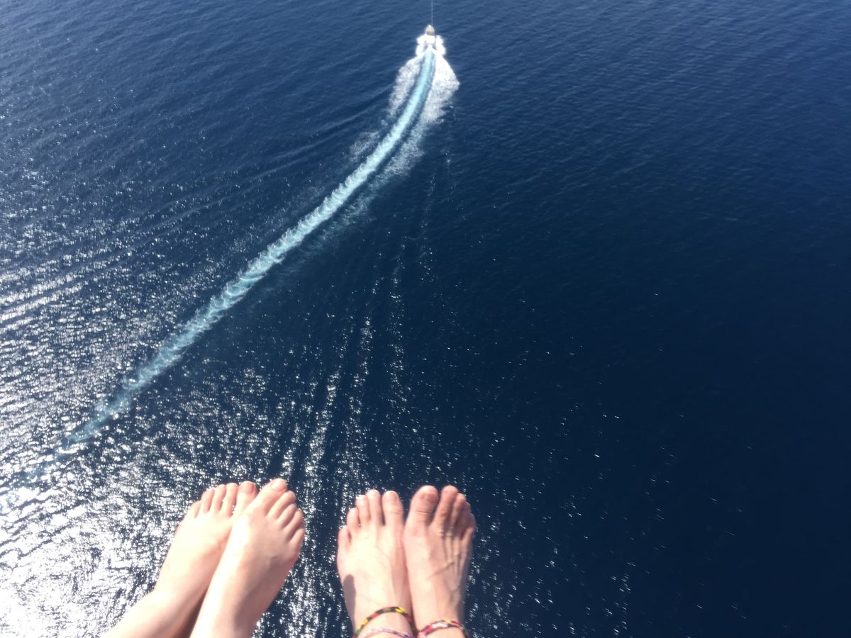 ボートに乗ってすぐ、スタッフに装具を着せてもらいふわっと空に放たれたらもう夢のよう♪私たちを乗せたボートがスピードを上げると、体が自然と宙に浮いていきました♪