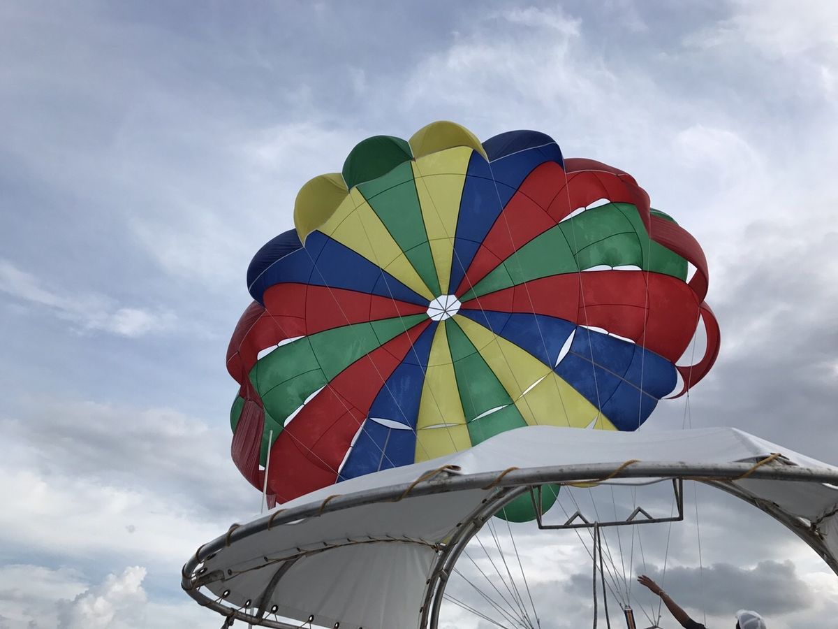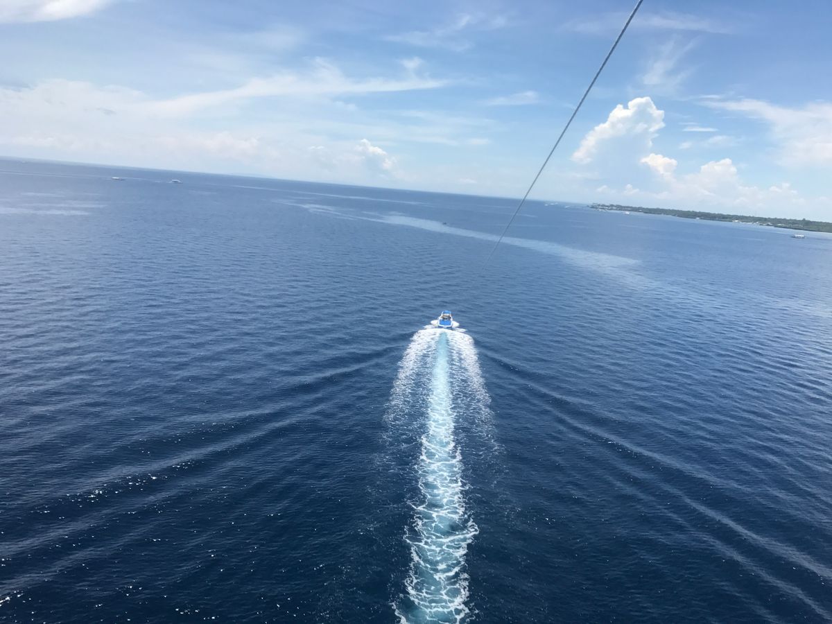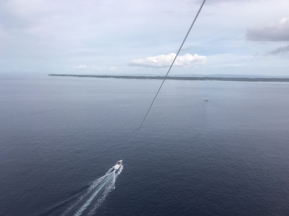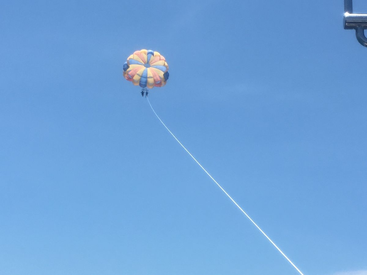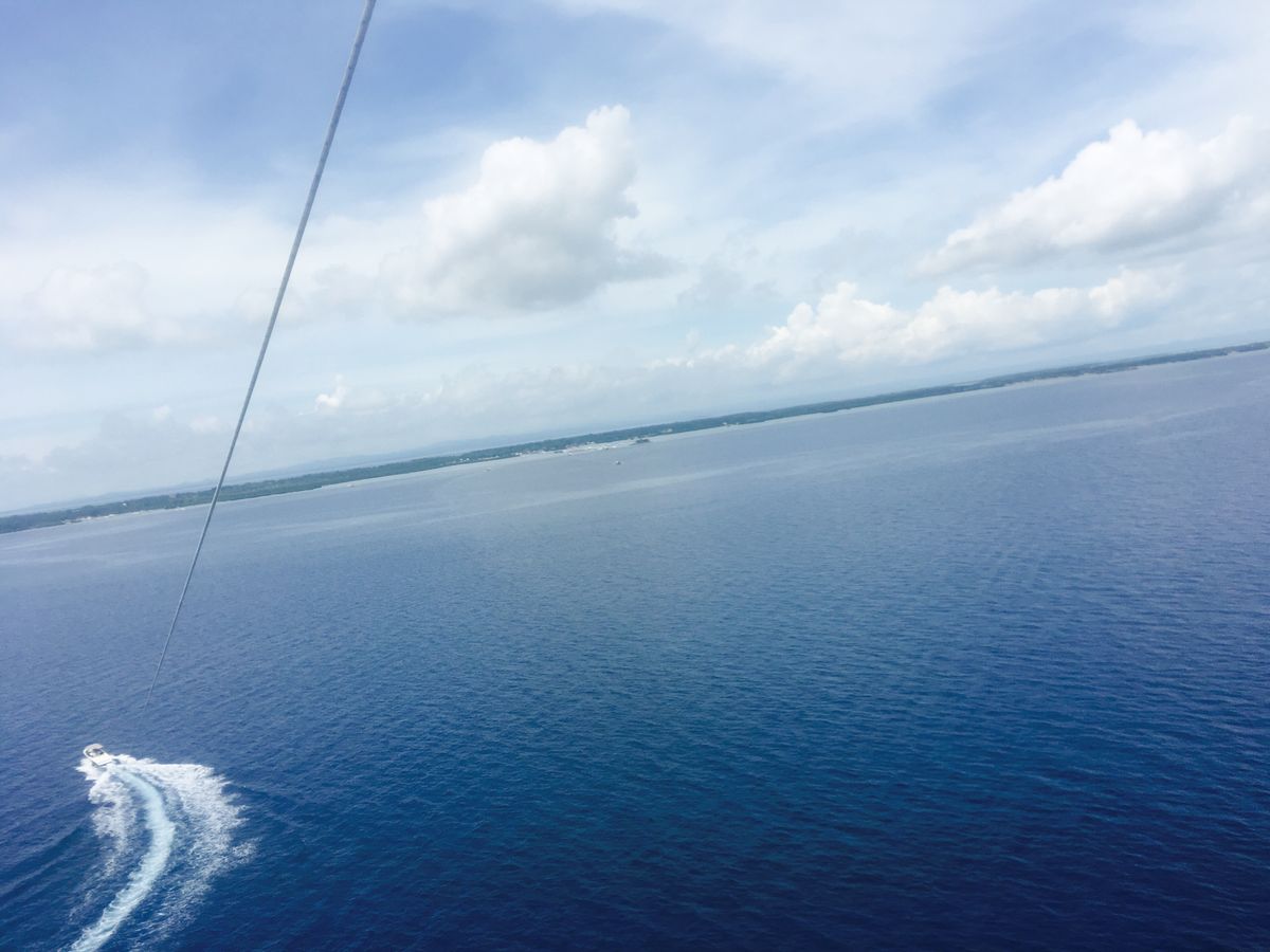 時間の都合上、パラセーリングのみを頼みました。パラセーリング用のボートまでは、別のボートで行きました。その間も海はとても綺麗で真っ青。5分程でパラセーリング用のボートに到着。乗り換えていざ出陣!ハーネスを付けて加速をつけてあっという間に大空に・・・。上から見る海の景色や町の景色が本当最高でした。15分というと短い感じがしますが、私は丁度いい感じだと思いました。着陸の時どうやって降りるのか・・・・??