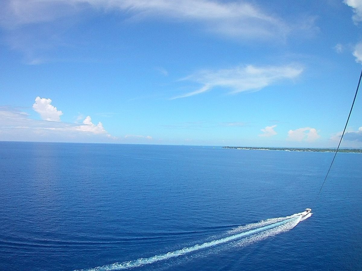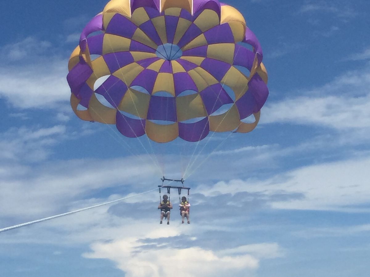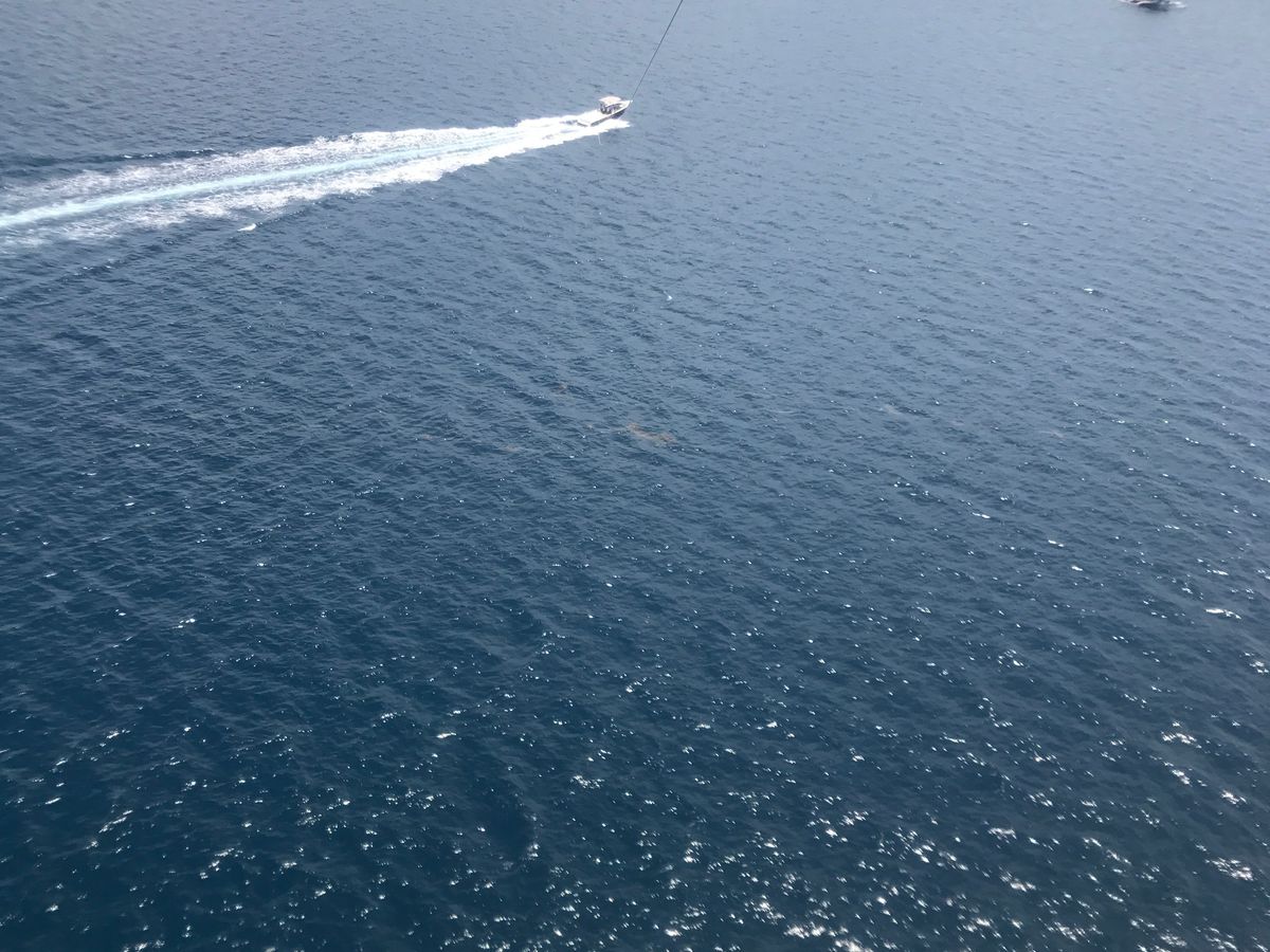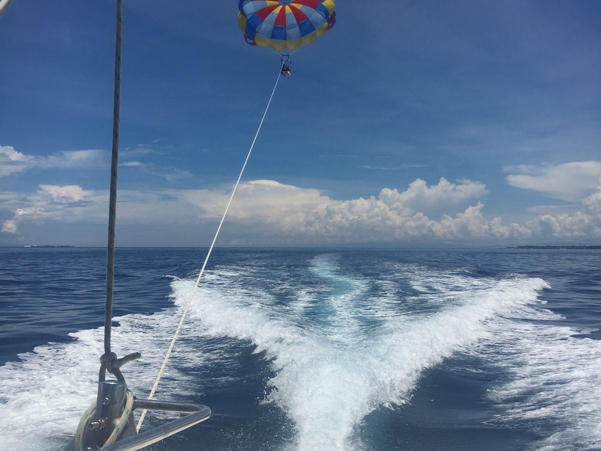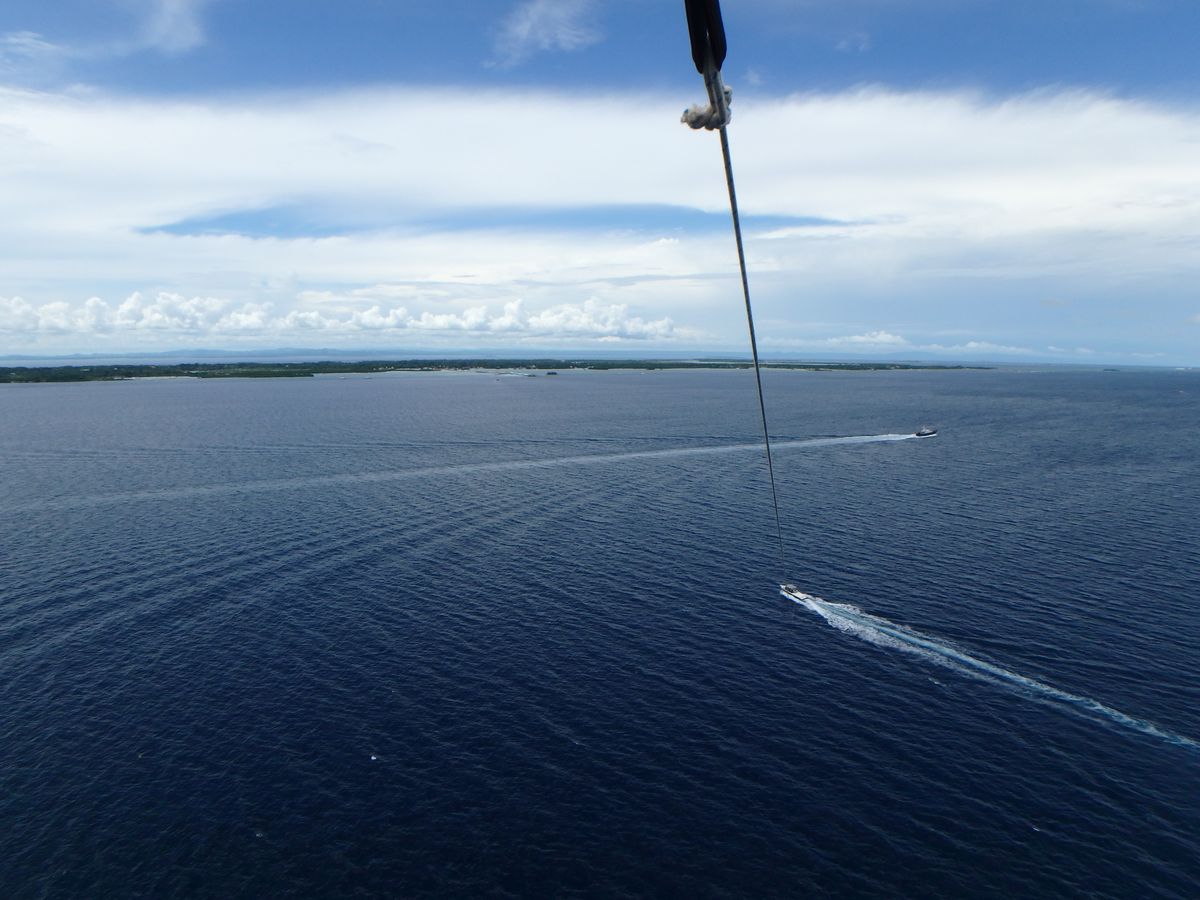 時間の都合上、パラセーリングのみを頼みました。パラセーリング用のボートまでは、別のボートで行きました。その間も海はとても綺麗で真っ青。5分程でパラセーリング用のボートに到着。乗り換えていざ出陣!ハーネスを付けて加速をつけてあっという間に大空に・・・。上から見る海の景色や町の景色が本当最高でした。15分というと短い感じがしますが、私は丁度いい感じだと思いました。着陸の時どうやって降りるのか・・・・??