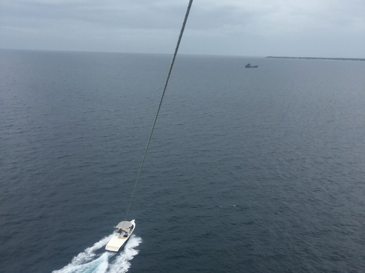 8人ほどのグループで船に乗って沖へ出発。そこから順番に2人ずつ空へ飛んでいきます。