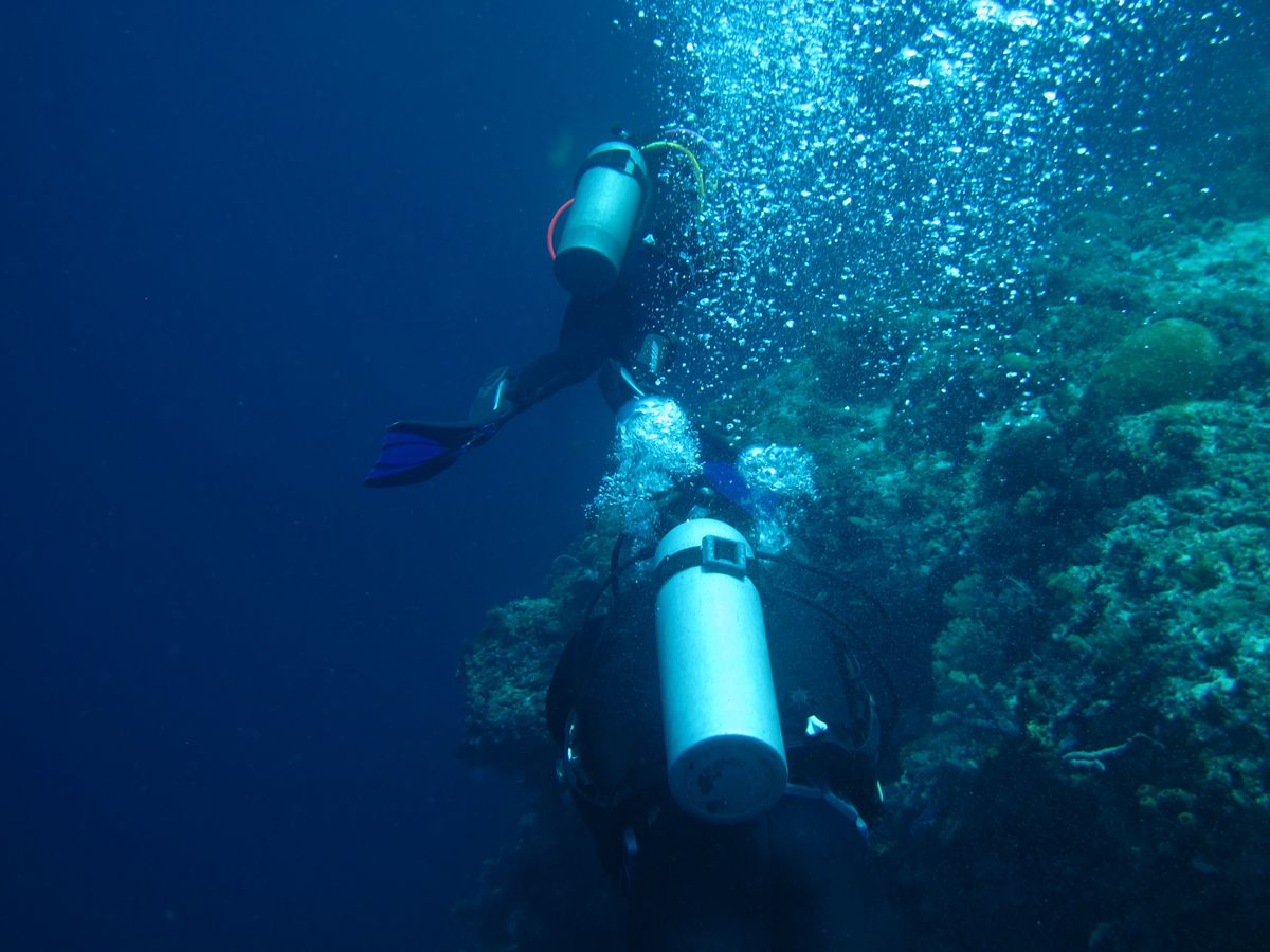 但し、絶対に注意して欲しいことがあります。装備がかなりアバウト感じなので(マスクにシュノーケルのホースが付いていない、BCのベルトが締まらない、ウェイトベルトを使わない等)、必ず使用前に状態を確認するか自分のものを持って行って下さい。また、ガイドにもよると思いますが、私の場合はアップダウンが激しいのに加えて、強い海流に逆らって泳ぎ続けたり、酸素残20以下になるまで続けたりする方でした。そのため初心者や久しぶりにされる方にはオススメはできないのと、それ以上の方でも連続で3本以上はきついと思います。自分の身を守るのは自分だという事をしっかり意識して臨んで頂ければ、安全に楽しめると思います。