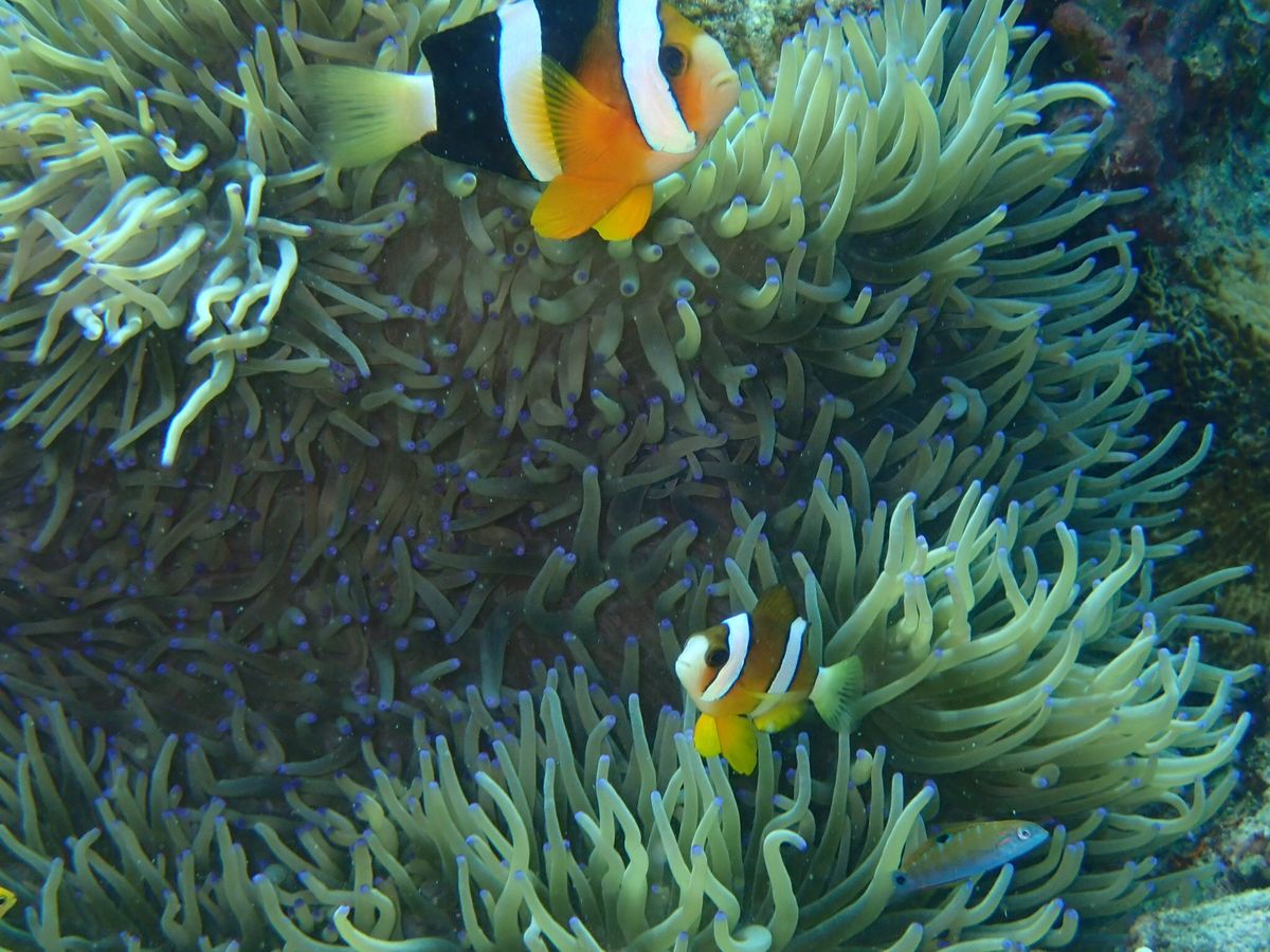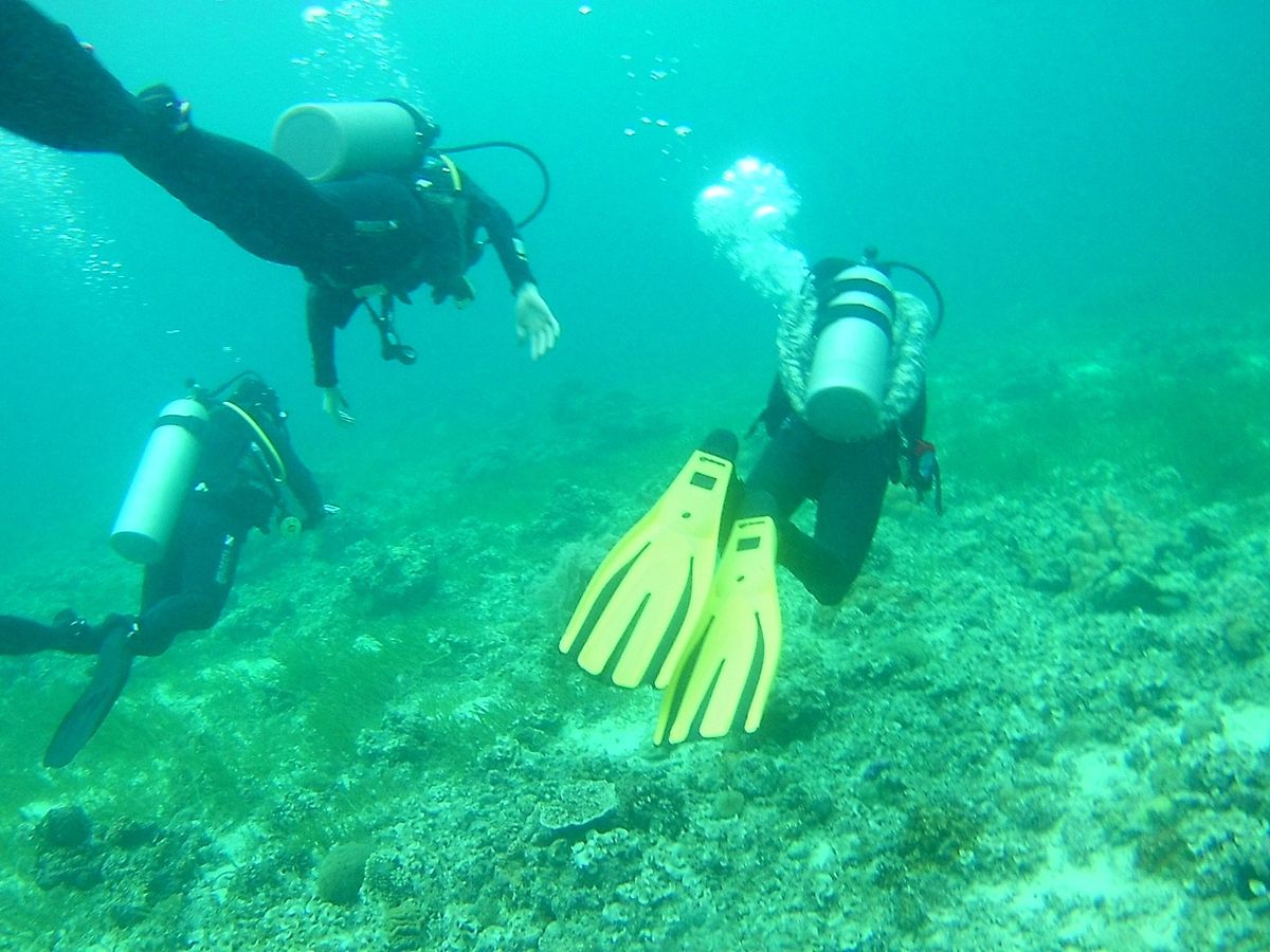 台風影響で予定のナルスアン島は行けず、ヒルトゥガン島とオルガン島のポイントを潜りました。他の参加者もおり、体験ダイビングチームとファンダイビング2チームに分かれて開始。器材セッティングはウェットスーツを着ているうちに整えてくれており、フィンを履いている後ろからもうBCDやタンクを背負わせてくれて…噂に聞いていた殿様ダイビングってこのことですね。私たちのインストラクターは現地の方でしたが、ちょっとした日本語(単語)は分かるようです。潜ってしまえば、サインやジェスチャーで色々な魚やヒトデを見つけては教えてくれました。少し濁っている感じはありましたが、十分きれいでした。珊瑚が多くプランクトンがたくさんあるためとのことです。
