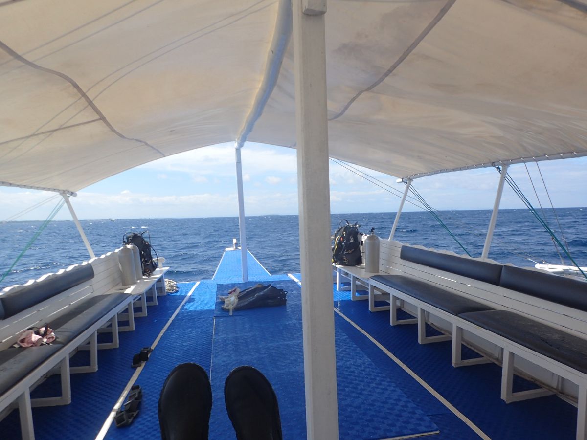当日、日本人の方が時間通りにホテルロビーまで迎えに来てくれました。ダイビングショップに着いてから、オリエンテーションを受け、ウェットスーツに着替え、いざ出発!ショップのすぐ裏手はもう海でした。ボートに乗って、目的のポイントまで向かいました。向かい風もあってか、はねあがった海水がばしばし顔に当たり、すでに濡れちゃうなんてことも。持参したタオルや上着は濡れないところに隠した方がいいですね。そんなこともあり、インストラクターの方と話しているうちにポイントに到着。