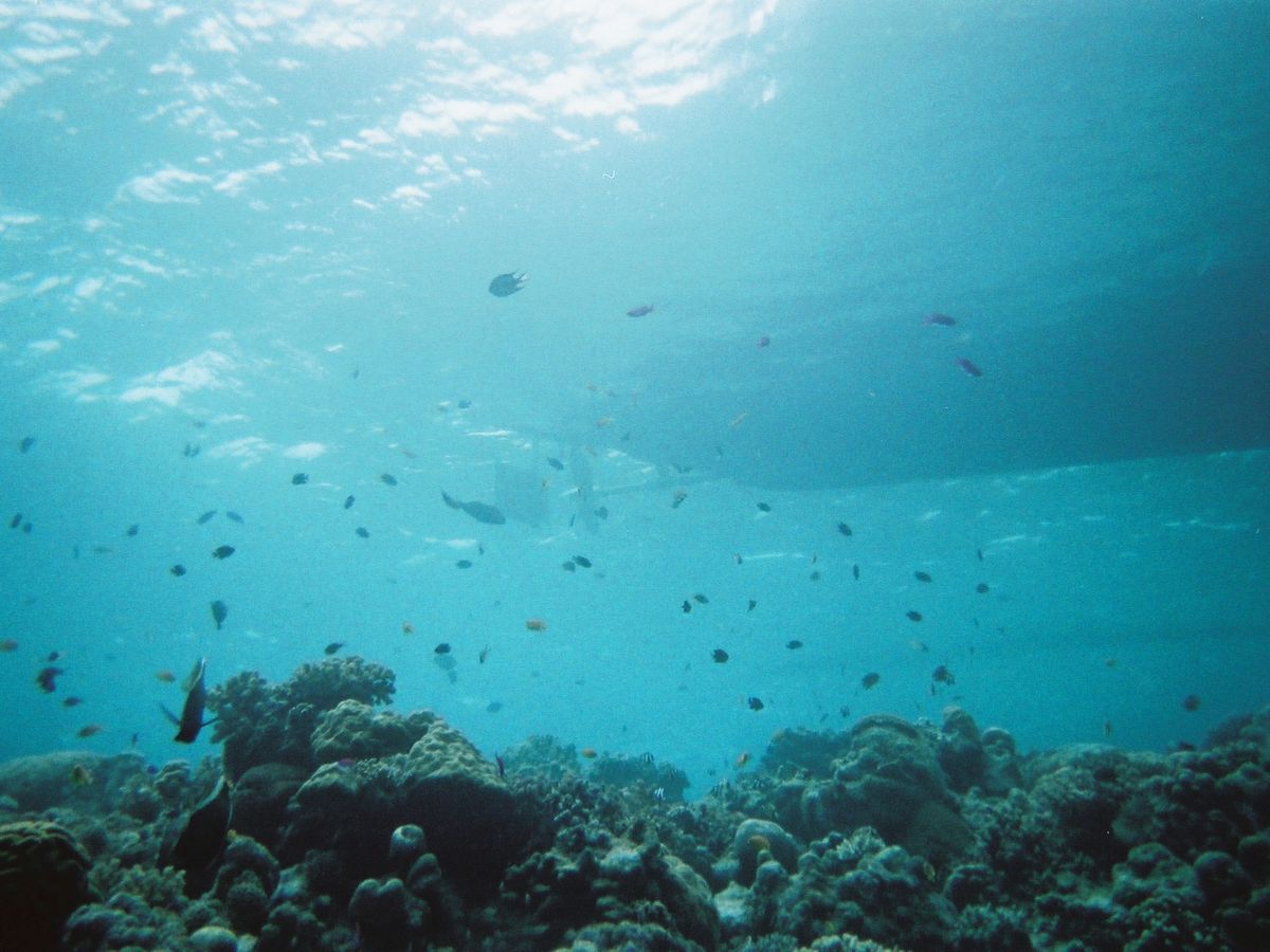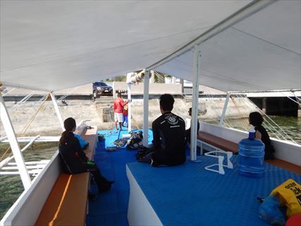ライセンスありグループの1本目は、ボートで10分程度沖へ出た隣のオランゴ島沖100m位?のポイントのところを約40分間潜りました。海へは、バックエントリーで入り水深7-8mのところから徐々に深いところへとすすみました。200-300匹の魚影やサンゴ、ミノカサゴ、チョウチョ魚?、などが見られ、とてもよかったです。大物には出会えなかったのが少し残念でしたが、次回までに、スキルUPして大物ポイントに連れて行ってもらえるようにしたいと、思いました。