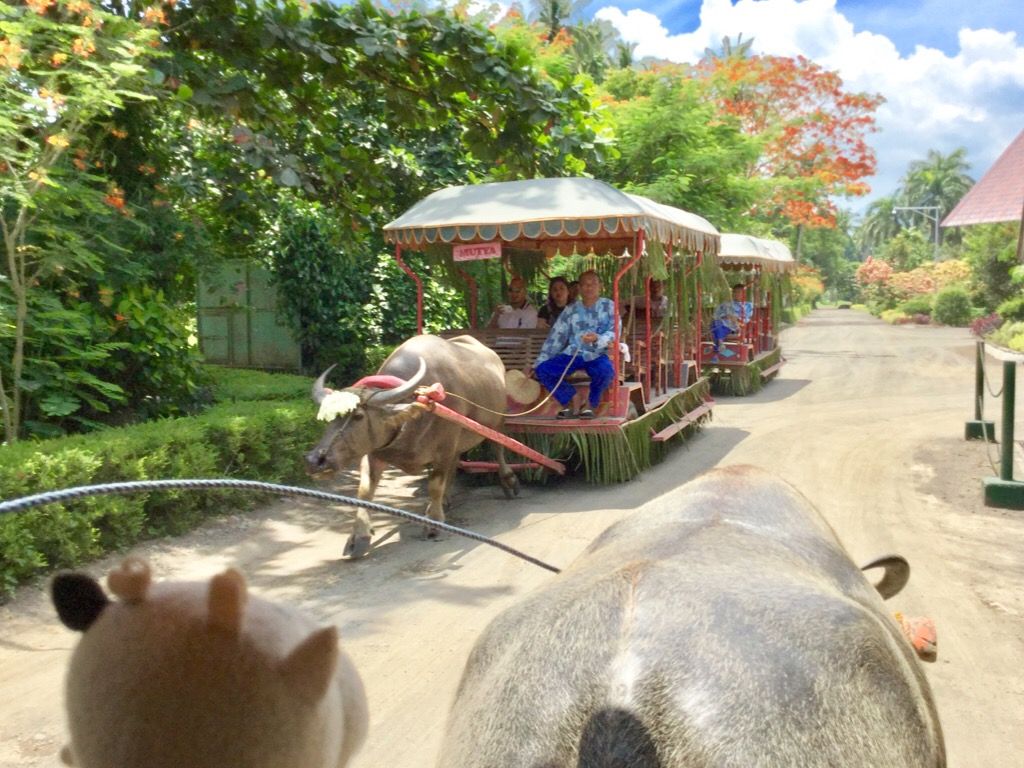 水牛が引っ張る牛車でのどかに移動する、プールサイドでリラックスできる、など郊外でゆっくりとした時間をすごせました。