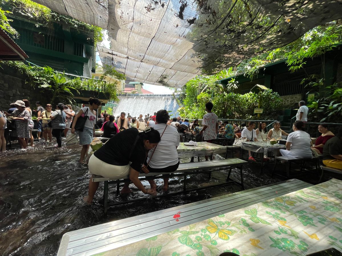 フィリピンの暑い気候の中、滝から流れる川の中で食べる昼食は良い思い出になったものと存じます。