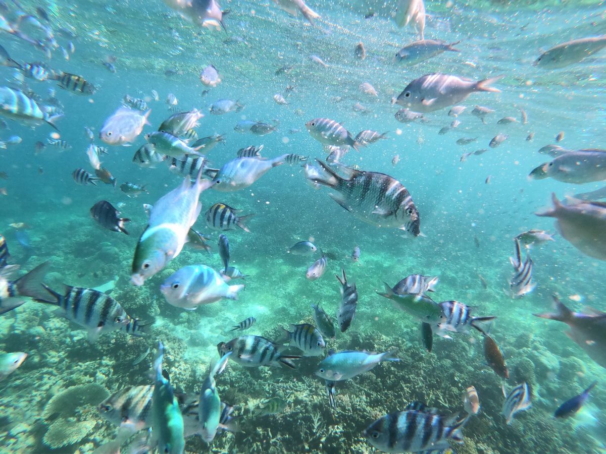 シュノーケリングをするときはツアーガイドが一緒に付き添ってくれます。また餌ももらえたので、シュノーケリングのときには魚が凄く集まってきました。