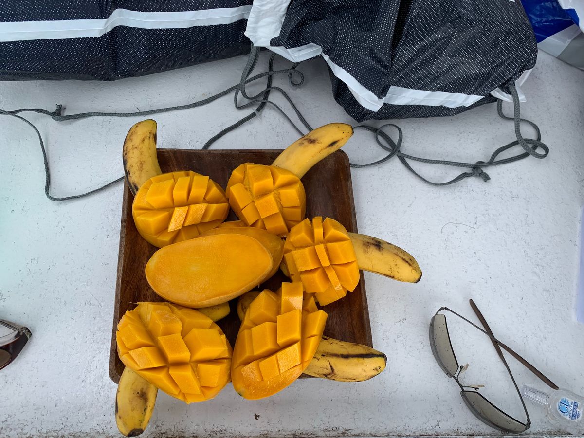 シュノーケリングを十分楽しんだあとは、船上にていただく濃厚なバナナとマンゴーは最高においしいです。