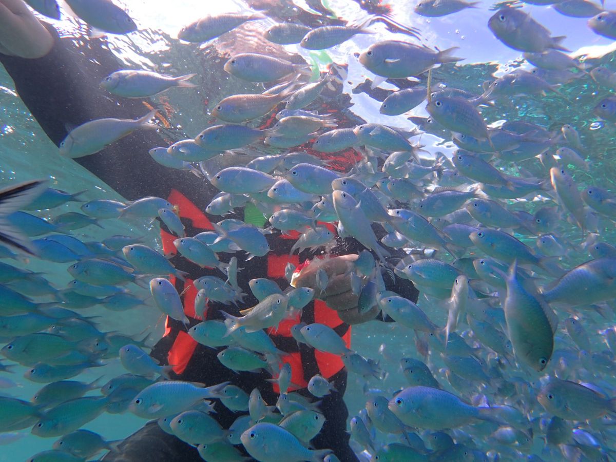 海面には海藻が沢山あり、透明度も悪く、ゴミ袋等が浮かんでますので、快適とは言えないシュノーケルタイムでした。海面では海藻をかき分けながらのシュノーケルですが、魚用のパンも渡されるので、魚は沢山集まってきます。スタッフの方のサポートもあるので泳ぎに自信のない方でも安心です。