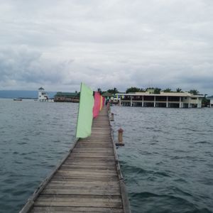 長~い桟橋を歩いてレストランに。肉、エビ、イカ、魚、カニとご飯が盛られたお皿の昼食です。缶ジュース1本が無料でもらえます。