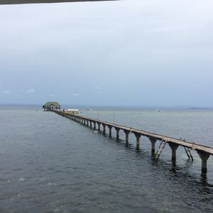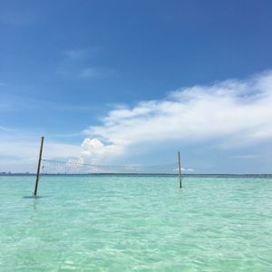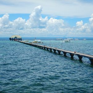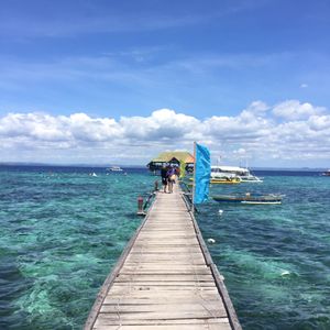 綺麗な海を眺めながら長い桟橋を歩いて渡り島へ向かう途中、一緒にいた彼女の麦わら帽子が風で海に落ちてしまいました。