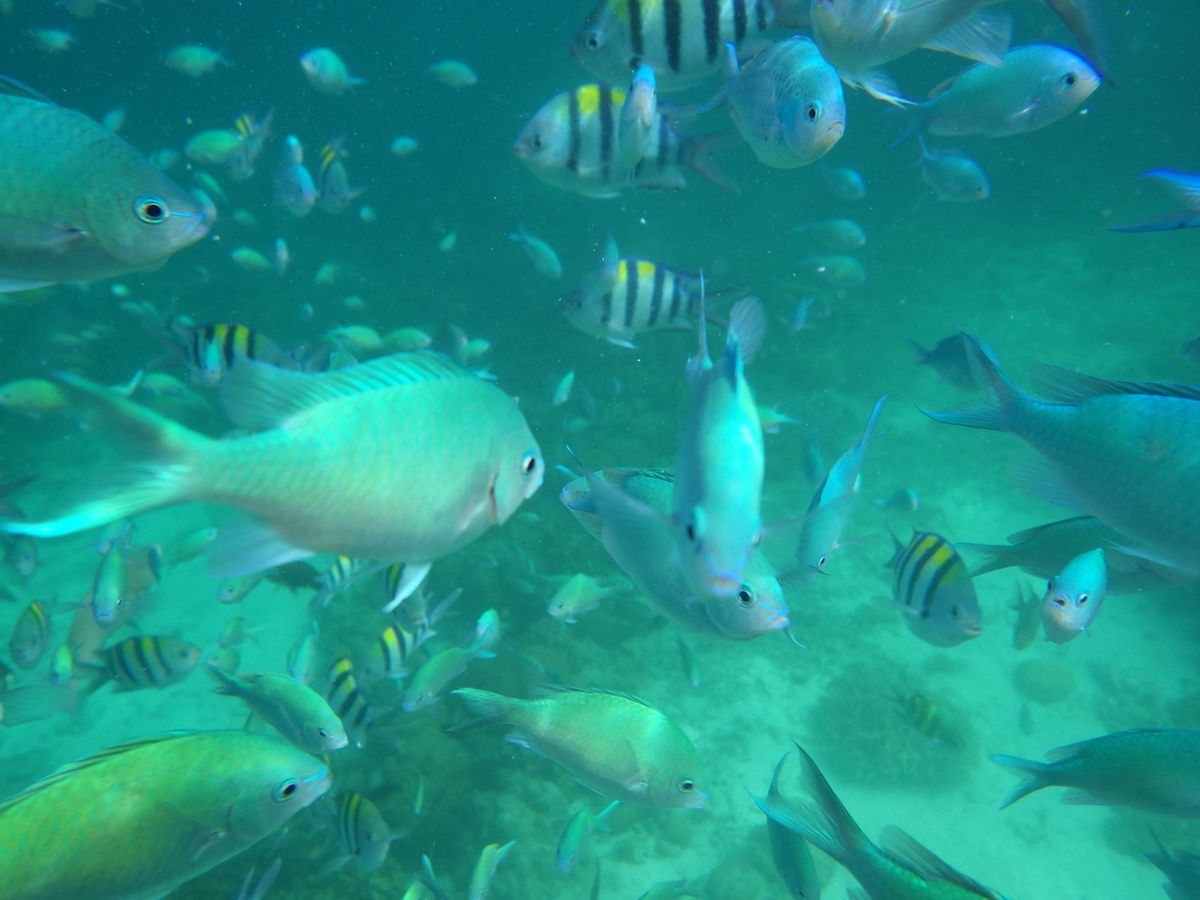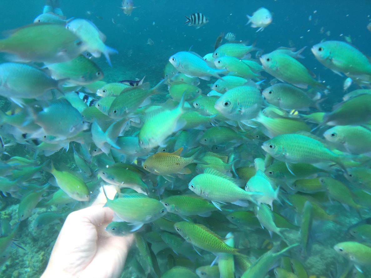 餌のパンをもって潜ると、たくさんの魚が寄ってきて食べてくれます♡