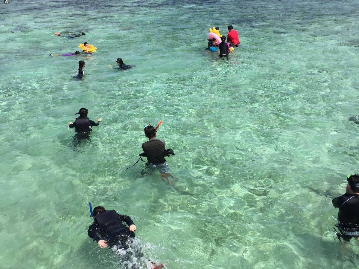 ナルスアン島は、桟橋下にシュノーケルポイントがあります。ヒルトゥガン島のポイントより透明度は高いです。こちらも浮きで囲まれているので混雑しています。