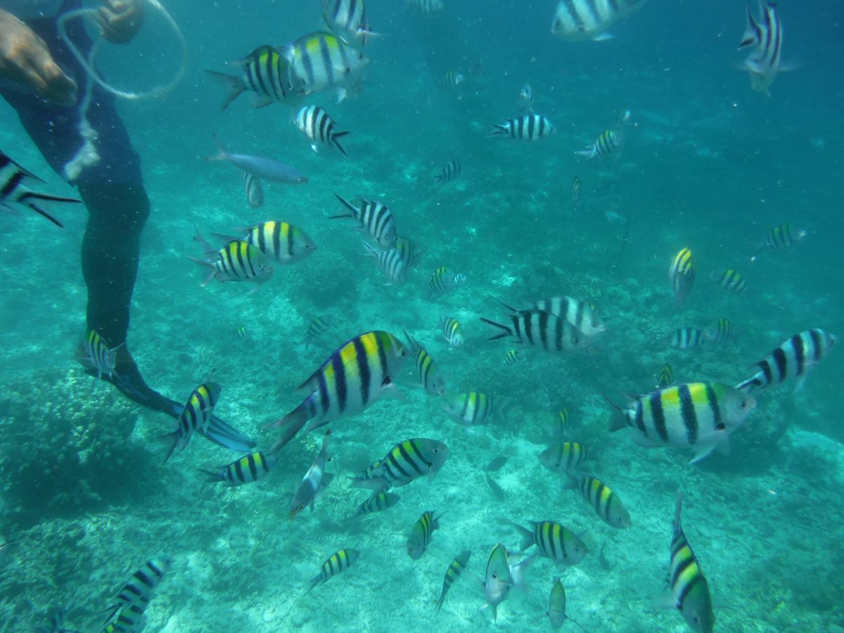 シュノーケリングでは パンを持って海に入ると すぐに魚達が目の前まで寄って来て パンを持っている手から直接食べてくれて感動しました。