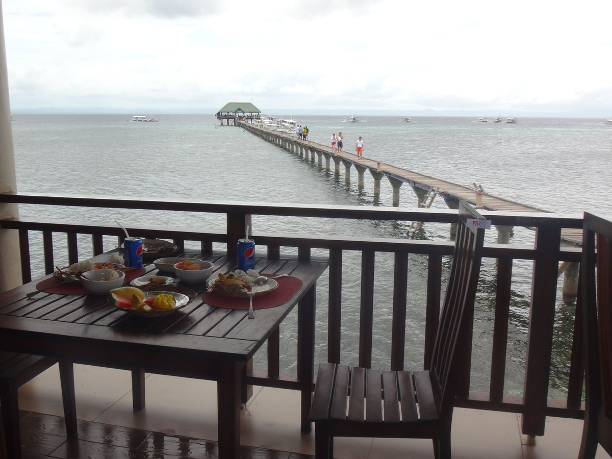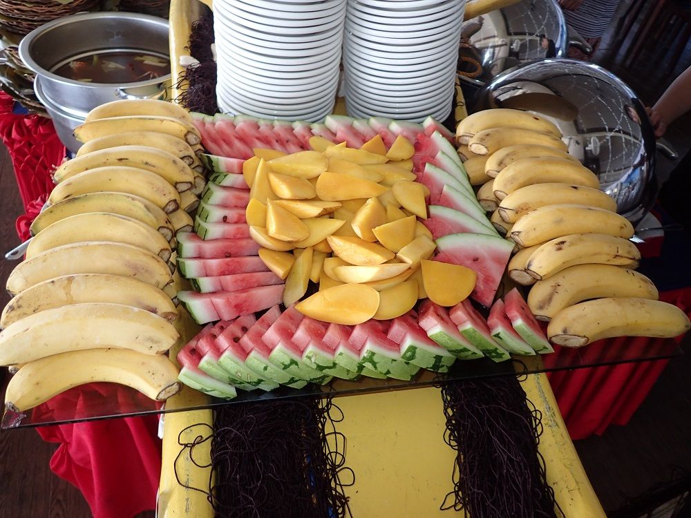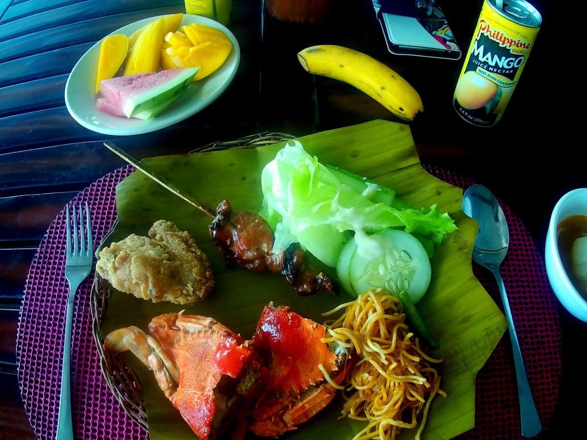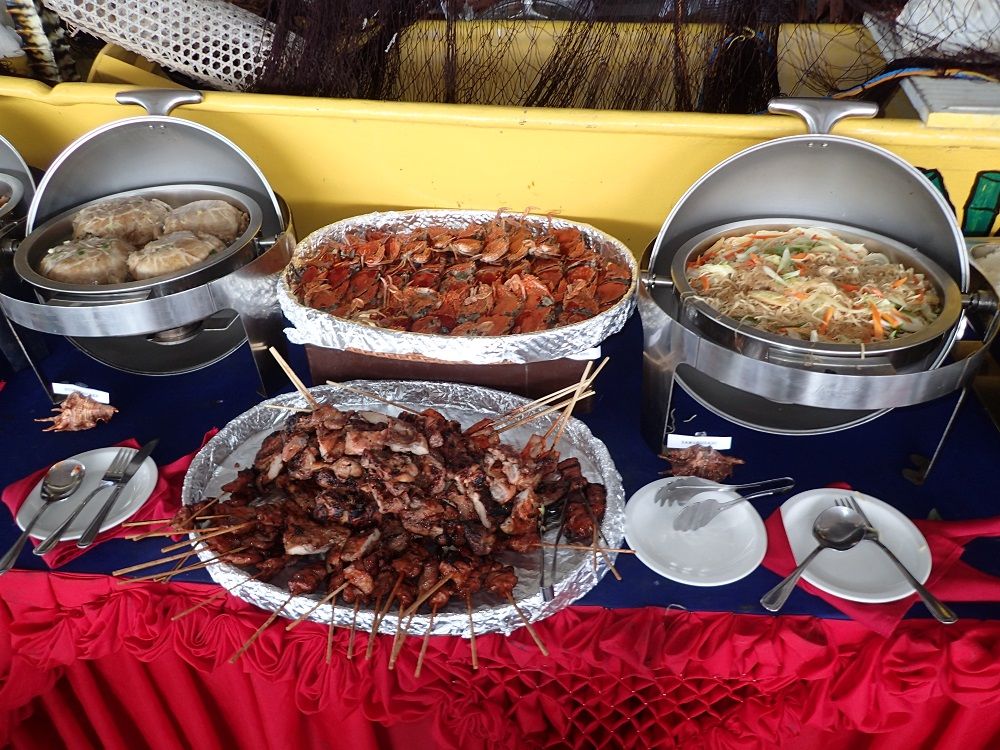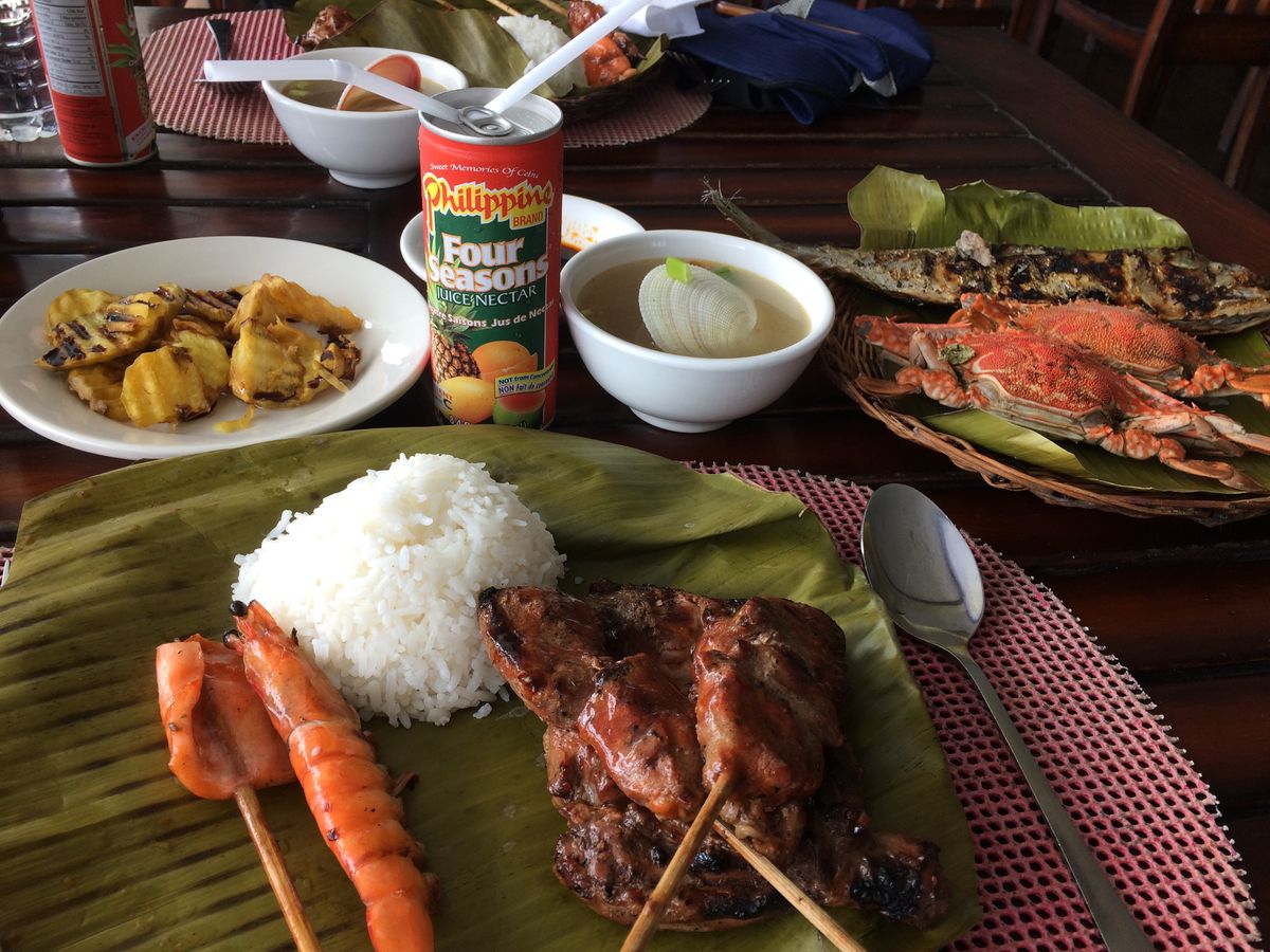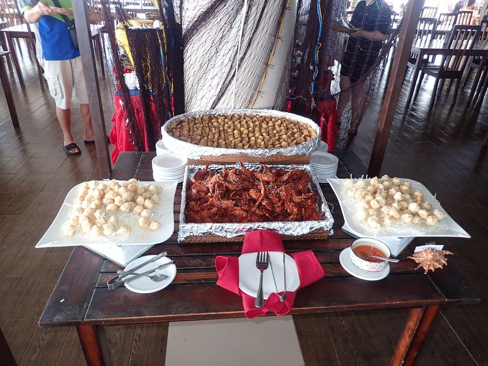 シュノーケルのあとは島へ移動。お昼はバイキング。この日は強風でシーサイド席での食事は不可能。フィリピン料理は得意ではないですが、食べられるものもたくさんありました!