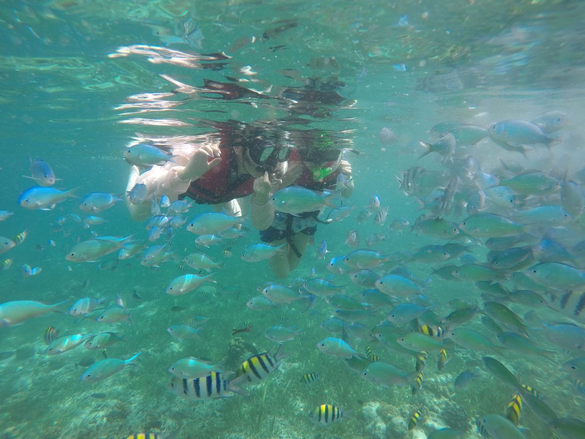 このアイランドホッピングを一番の楽しみにして私はセブ島に来ました。朝集合時間前からホテルの下に日本語の話せるガイドさんが来て、待ってくれてました。セブシティのホテルに滞在していたのですが、ガイドさんが会話してくれたりして、すぐにボートまでたどり着きました。ボートは結構大きくて波の影響はあまり受けませんでした。シュノーケルスポットまでの間、写真を撮ったりボートの前の方に行って足を下ろしてみたりして楽しむことが出来ました。そして、到着していざシュノーケルが始まるとなると、なんと餌のパンを用意してくれていてそれを使って魚を寄せるよう言われました。そこまで準備してくれていてとても嬉しかったです。海はもちろん見たことないくらいきれいな青色で、魚達もとてもカラフルで可愛かったです。パンが予想以上の力を発揮しました。その後は有名なナルスアン島で現地のランチを頂きました。やはりマンゴーが美味しかったです。昼食後は2時間ほど自由時間があり、とてつもなくきれいなビーチや橋の上で写真を撮ったり、ハンモックでのんびりしたりしました。さらに余った時間でなんと、もう一度シュノーケルさせていただきました。魚と一緒に泳ぐのは本当に楽しくて夢中になってしまいますよ!!!道具なども必要以上に準備してくれていて、スケジュールの時間も余裕を持って組まれているので安心です。そしてこの安さです!!迷ったら、このプラン申し込むべきです!!!