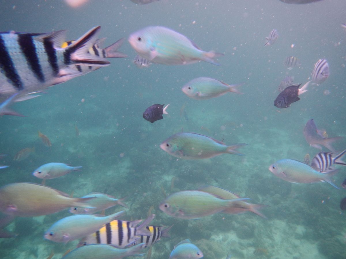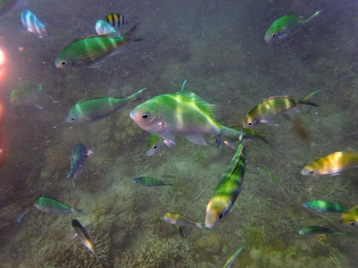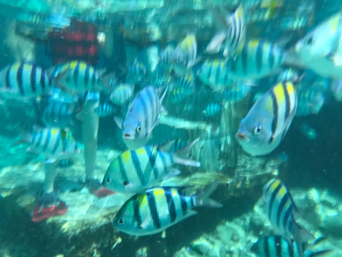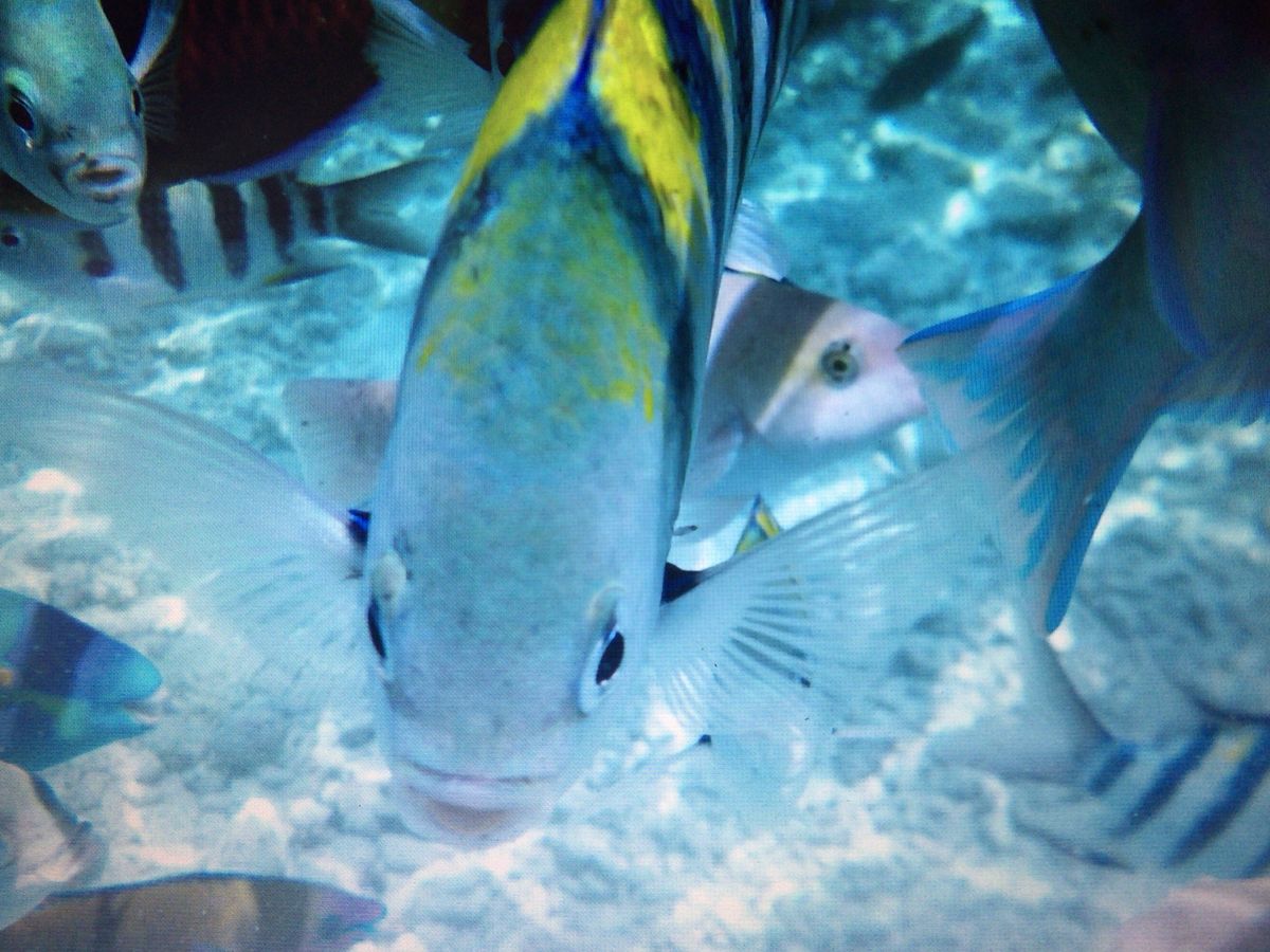 シュノーケリングは餌を頂き、たくさんの魚たちが寄ってきました。