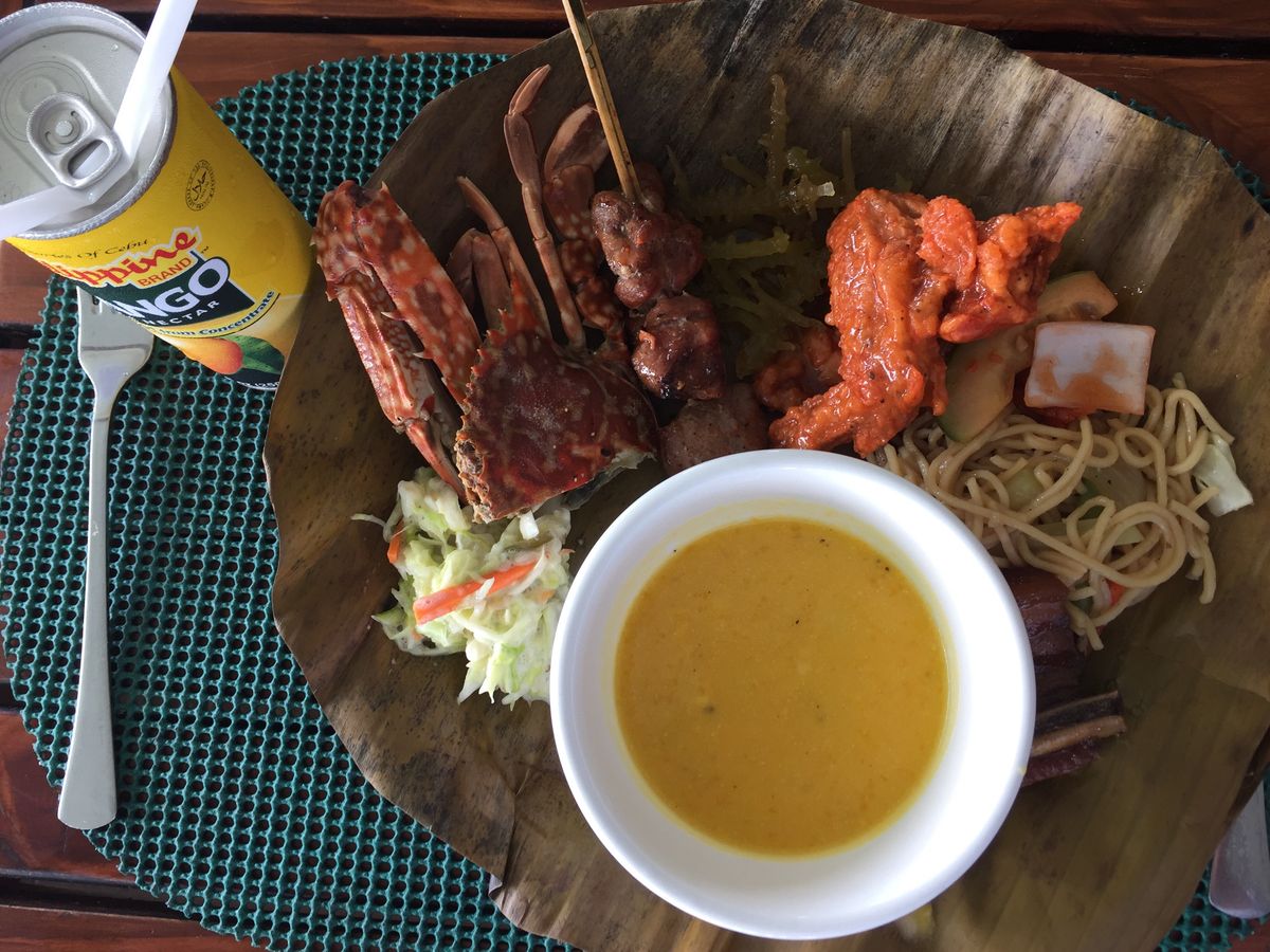 長~い桟橋を歩いてレストランに。肉、エビ、イカ、魚、カニとご飯が盛られたお皿の昼食です。缶ジュース1本が無料でもらえます。
