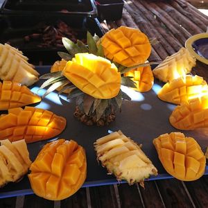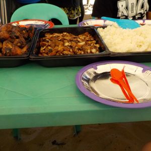 シュノーケリングが終わると、次の島に移動してBBQランチ。骨付き肉やソーセージ、ご飯、フルーツ、外で食べるのは美味しいですね(^^)